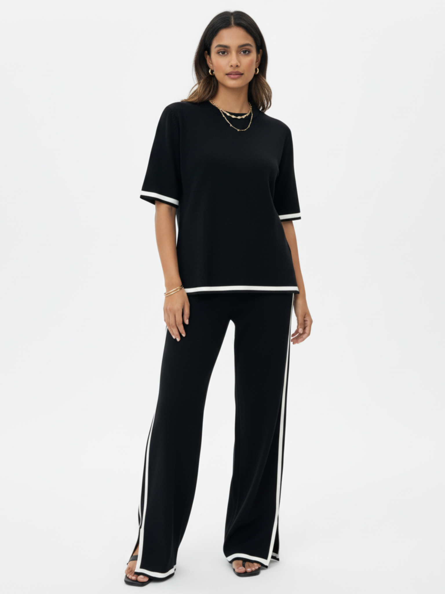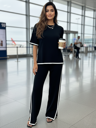 Effortless, elegant, and designed for movement — the Classic Black Knit Travel Co-ord Set is your ultimate companion for jet-setting in style. Crafted from a soft stretch-knit fabric, this co-ord offers unmatched comfort with a sleek, tailored finish. The black short-sleeve top features crisp white piping along the hem and sleeves, perfectly complementing the wide-leg trousers with matching side detailing. Lightweight yet polished, this set is ideal for long flights, casual city strolls, or chic off-duty moments.
