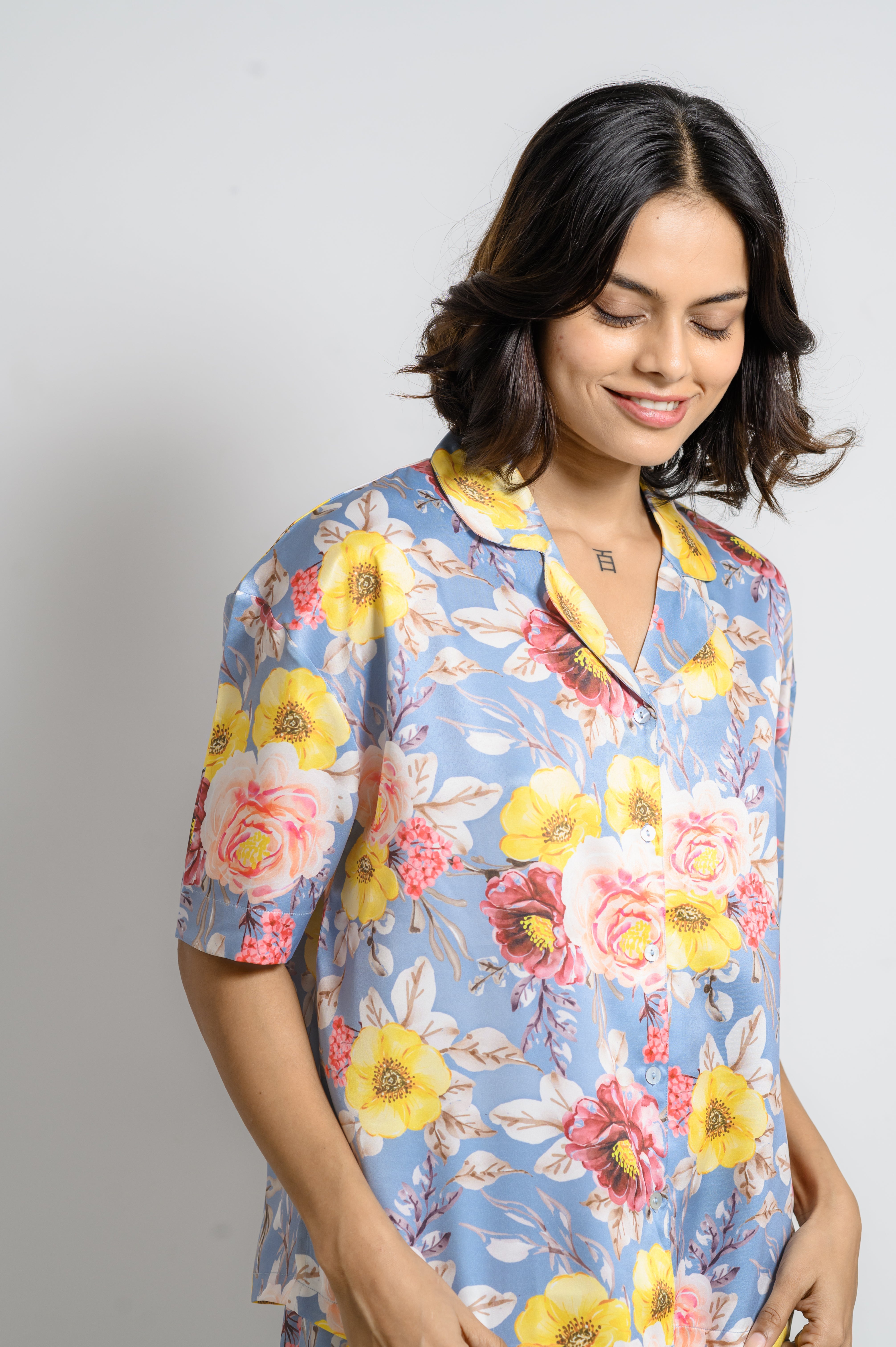 Slip into sunshine with this eye-catching floral satin night suit—your go-to for stylish downtime on international escapes. Designed for ease, this non-static, wrinkle-free set ensures you look polished straight out of the suitcase.