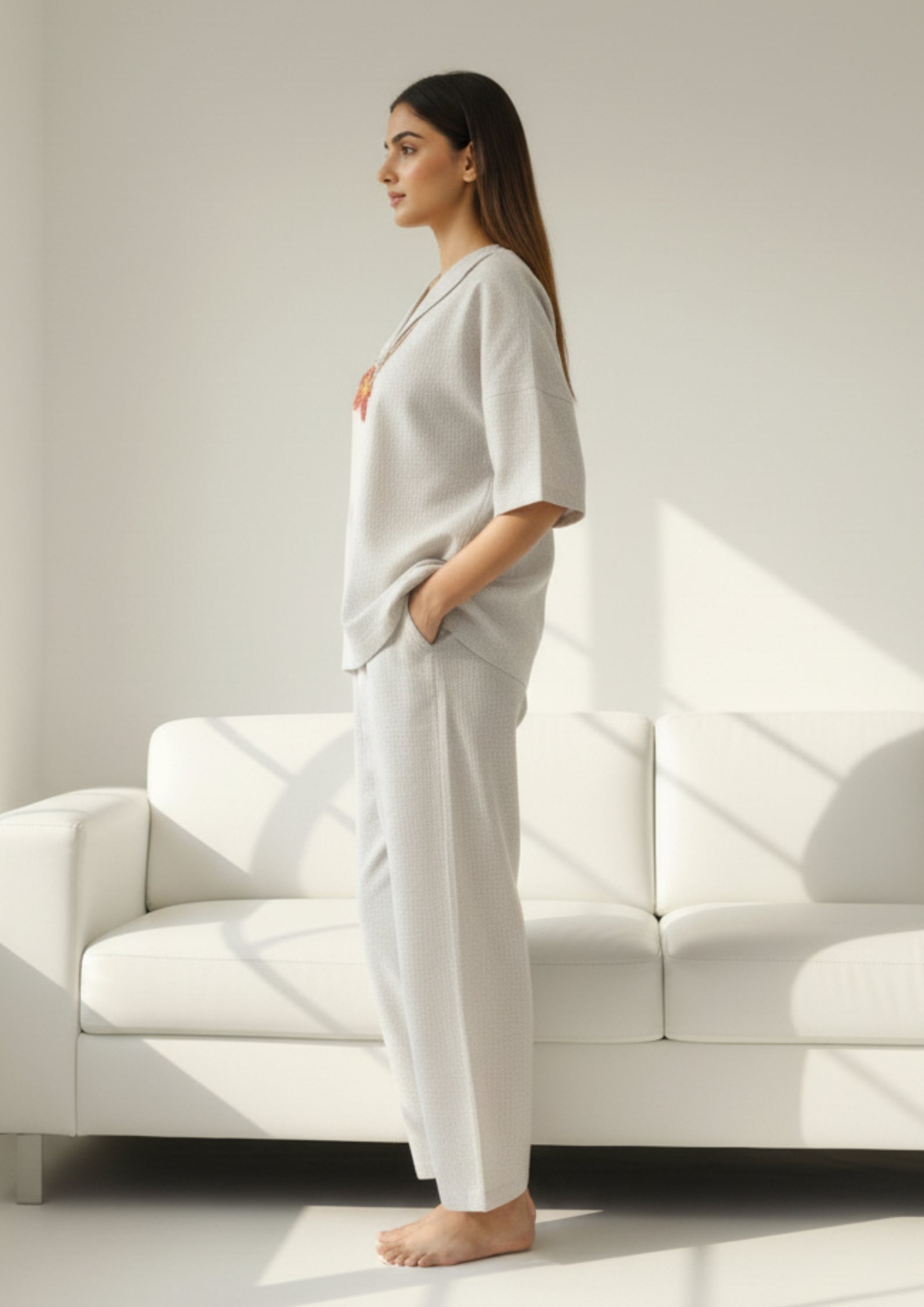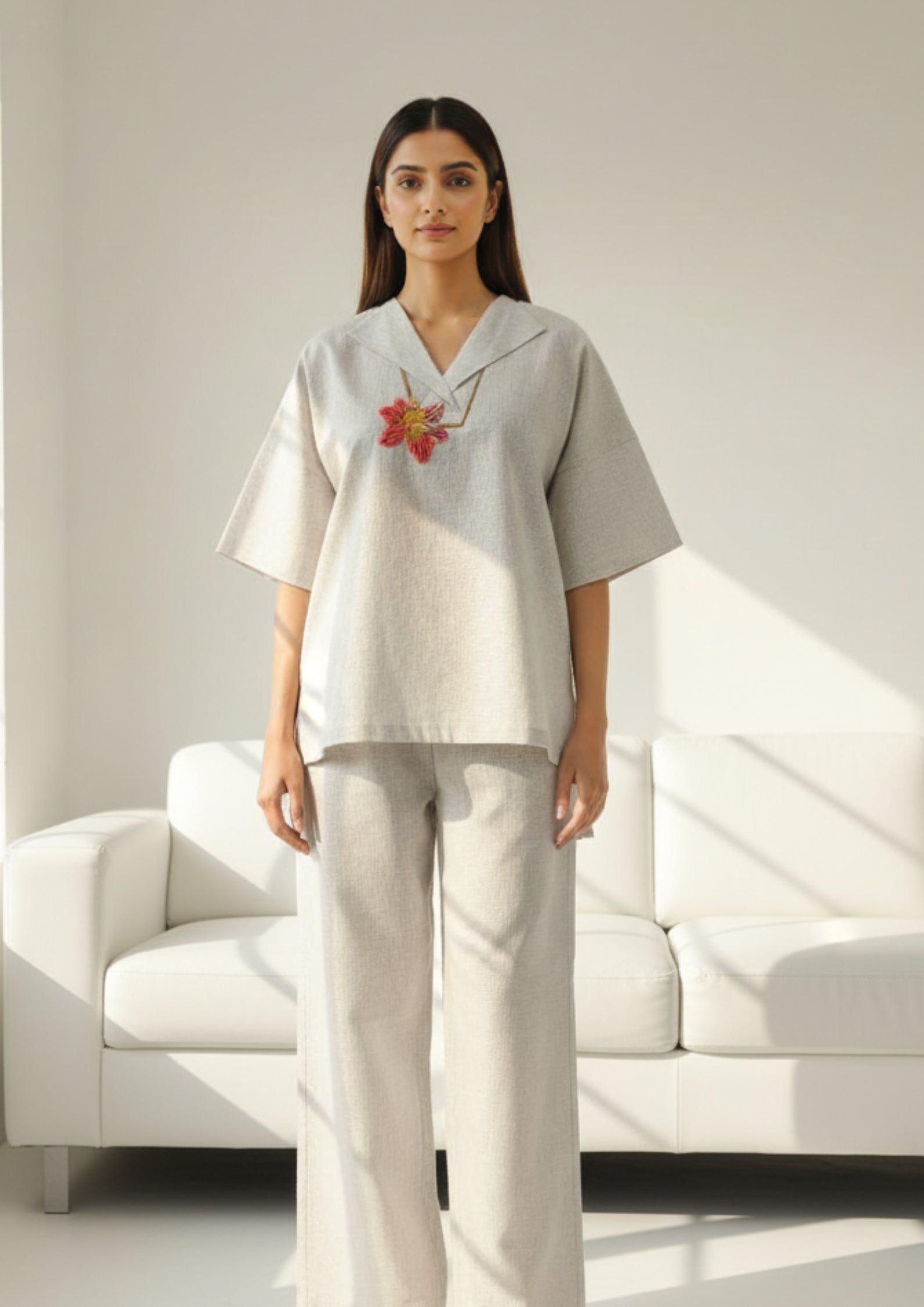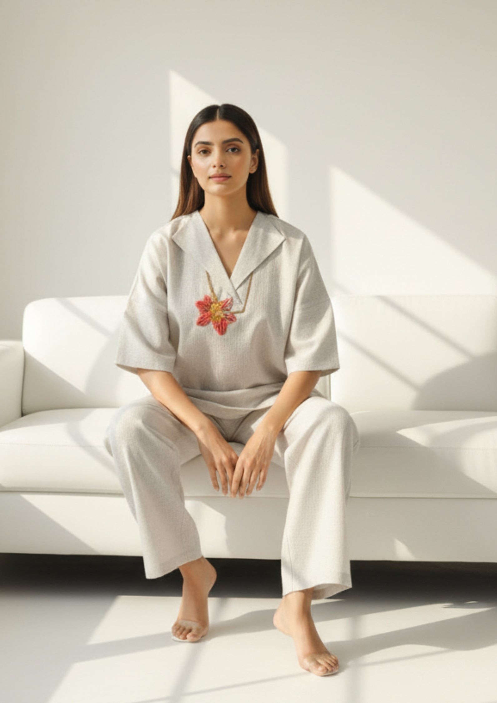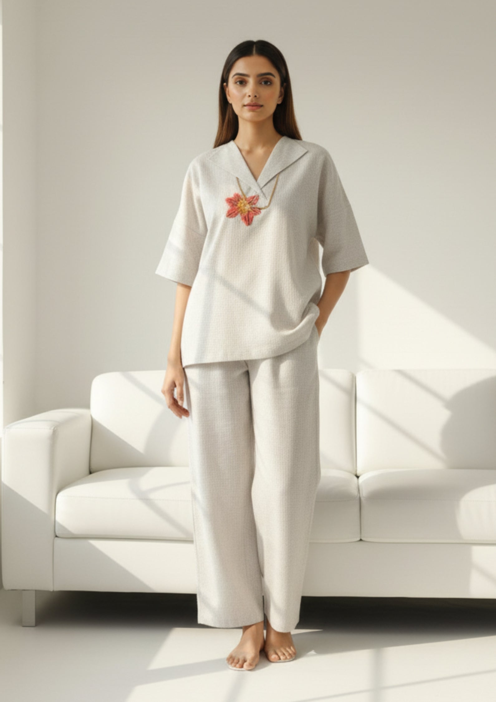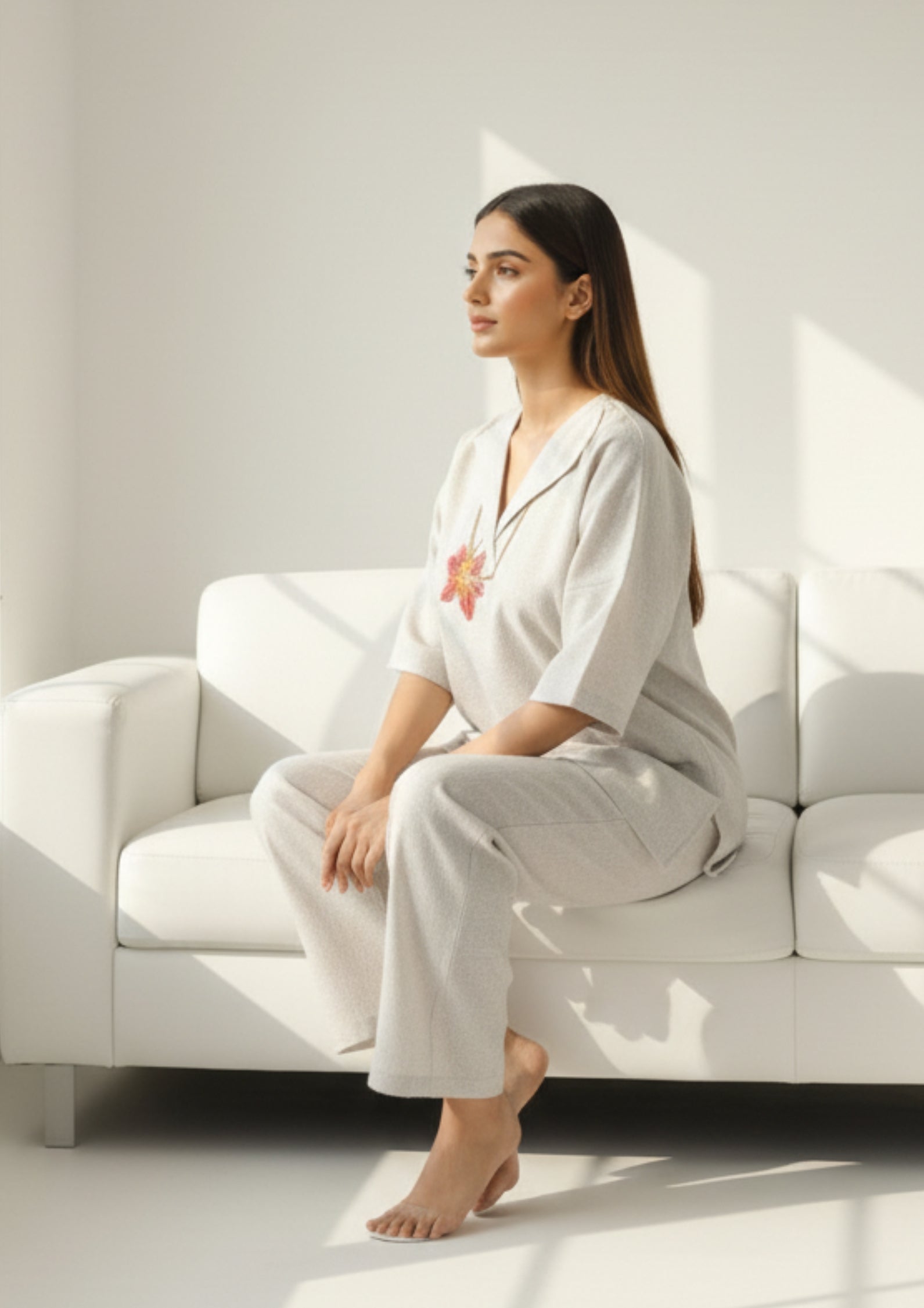 The Blush Charm Hand-Embroidered Night Suit is a symbol of quiet luxury — thoughtfully crafted for those who value comfort with a touch of artistry. Made from premium, soft-touch cotton, this two-piece set features a subtle neutral hue brought to life with hand-embroidered floral motifs in pink and coral tones. The relaxed fit and airy silhouette ensure ease of movement, making it ideal for serene evenings or cozy mornings at home.
