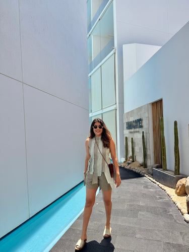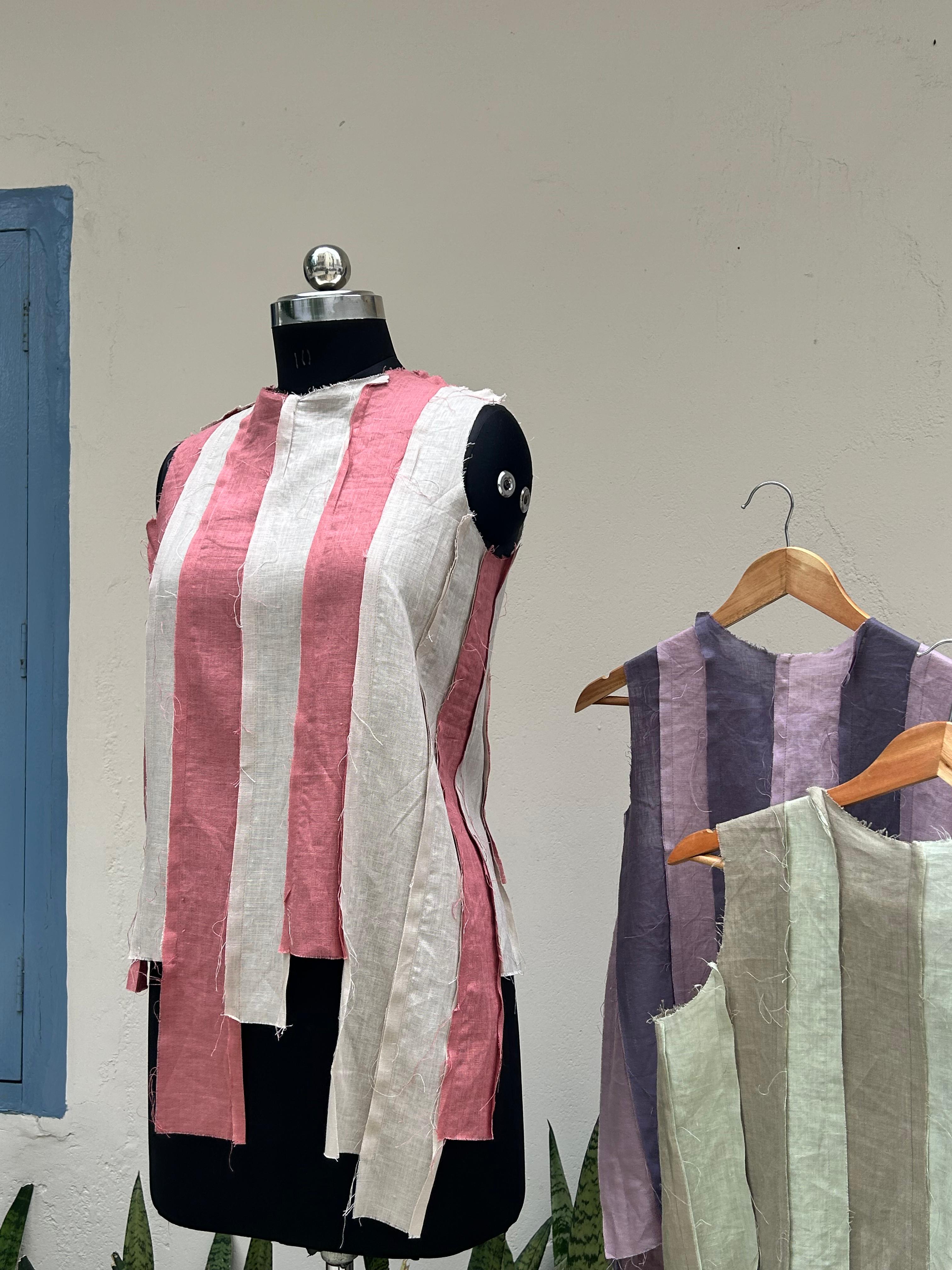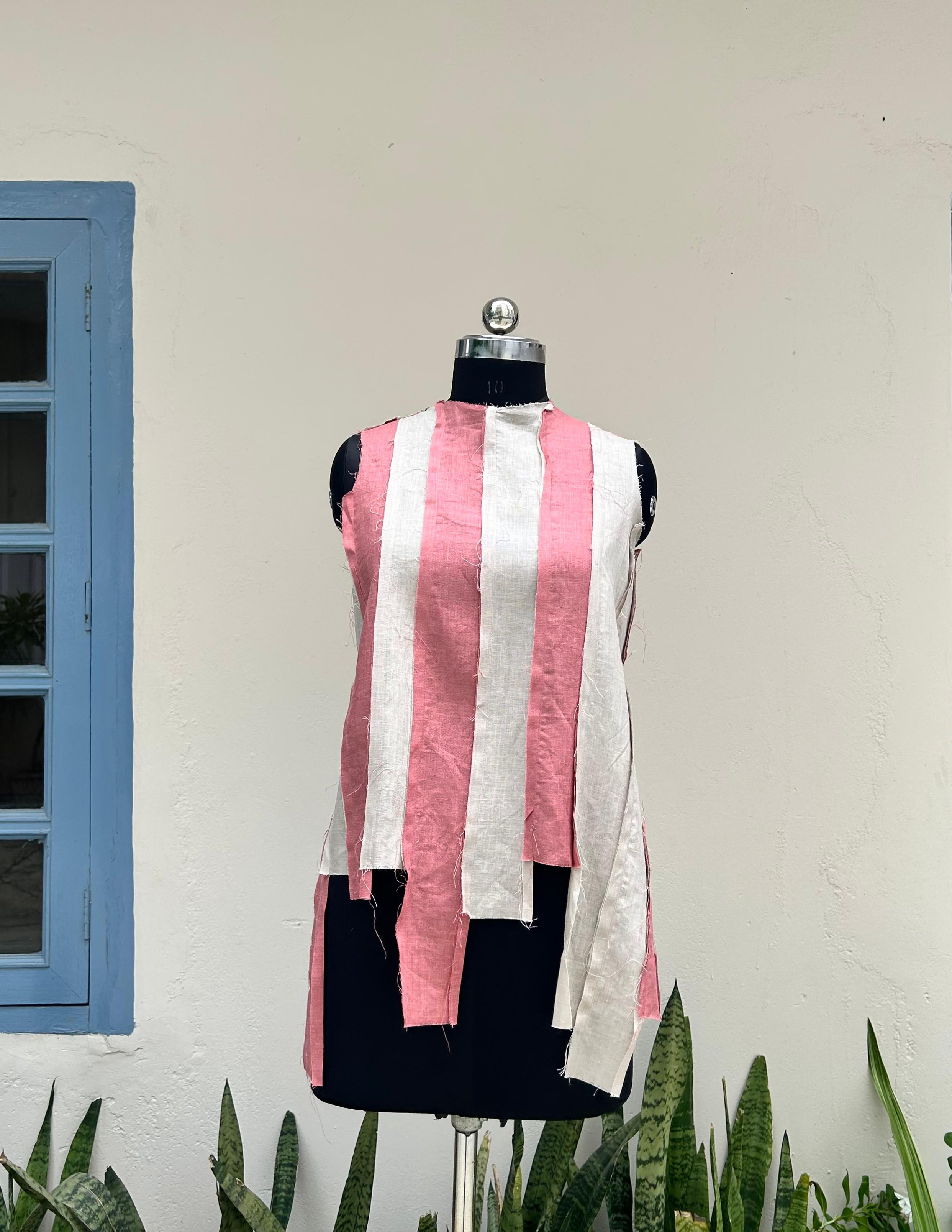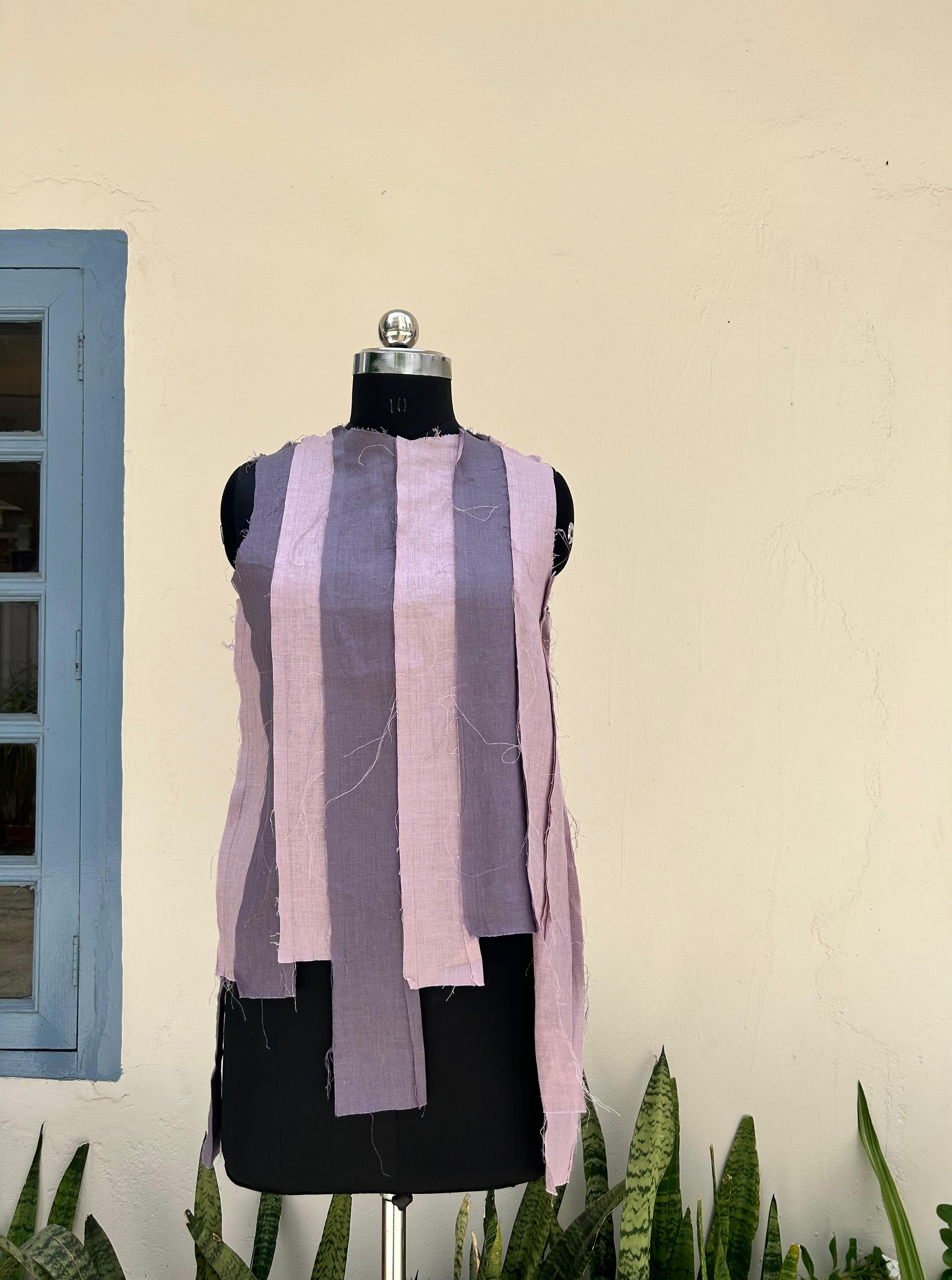 ffortlessly modern, this European linen top is crafted in a sleeveless, panelled design with alternating strips for a textured finish. The open back ties add adjustability and ease, while raw edges and deconstructed details give it a contemporary, artisanal feel. At 25 inches in length, it’s a versatile piece perfect for layering or styling solo.