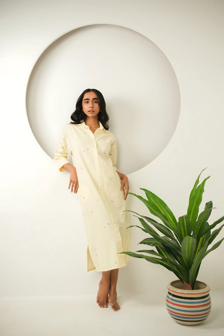 - Soft butter-yellow cotton with pastel dragonfly embroidery