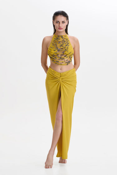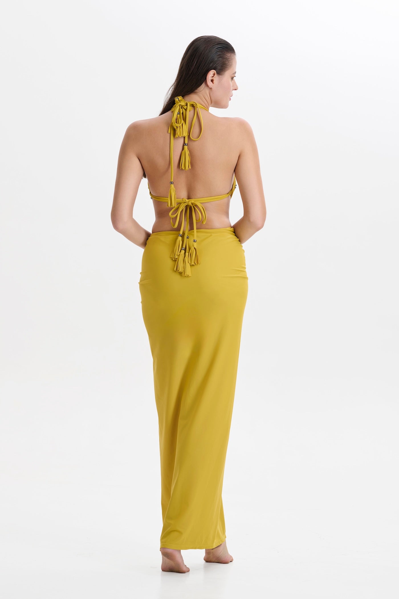 Step into radiant elegance with the Cartagena 4-Piece Swimsuit Set in golden yellow, designed to capture the glow of sunlit shores. This statement ensemble includes a sleek bikini, a shimmering hand-beaded mesh cover-up, and a flowy draped skirt that moves effortlessly with every step. Each piece is crafted to layer beautifully, offering the perfect balance of glamour and ease for any luxurious resort moment.