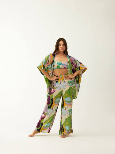 A relaxed silhouette that blurs the line between cape and classic resort shirt. This oversized square-cut piece features a button-down front and elongated sleeves, all crafted in lightweight luxury textured crepe for effortless drape and movement.