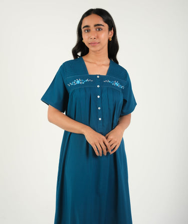 Slip into understated elegance with this teal blue nighty — a full-length silhouette that combines comfort with refined detailing. Designed for relaxed evenings and everyday ease, it’s a timeless sleepwear essential.