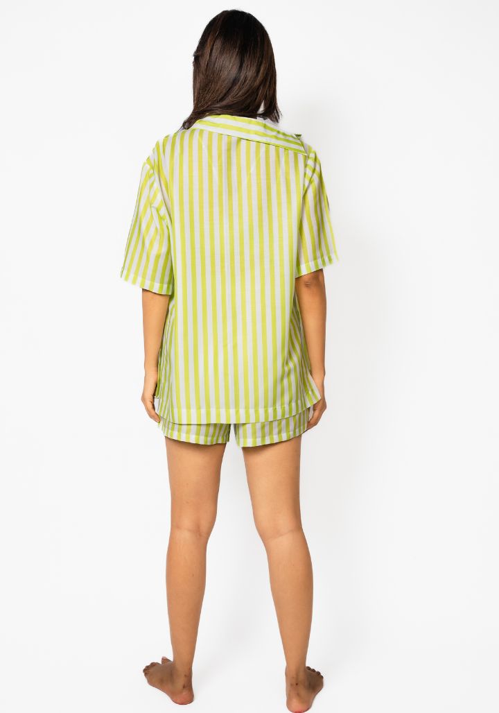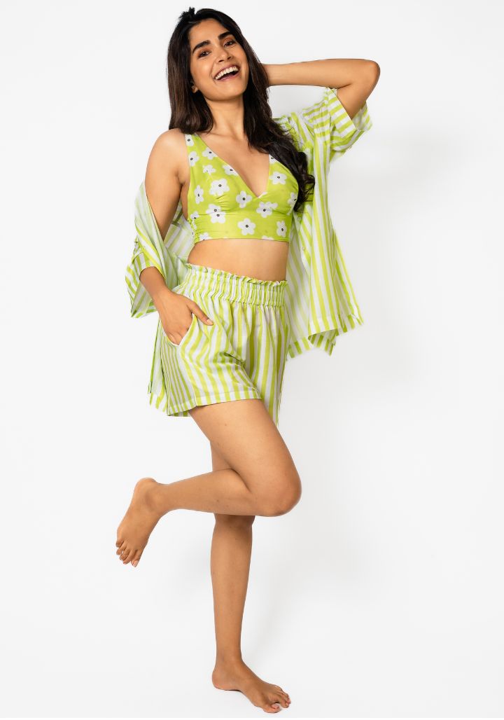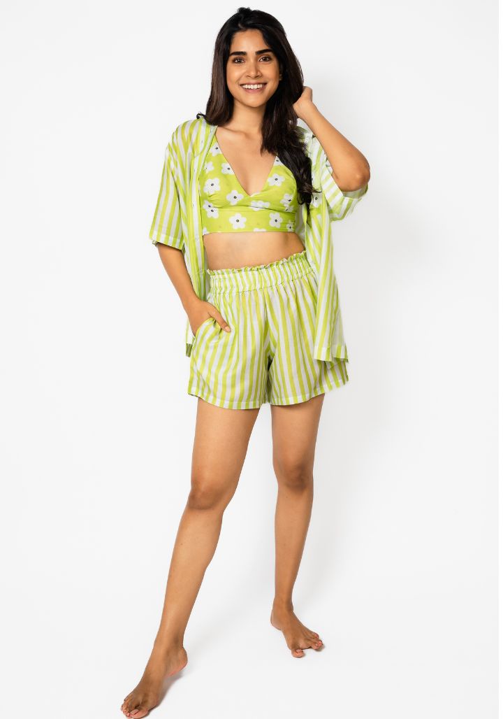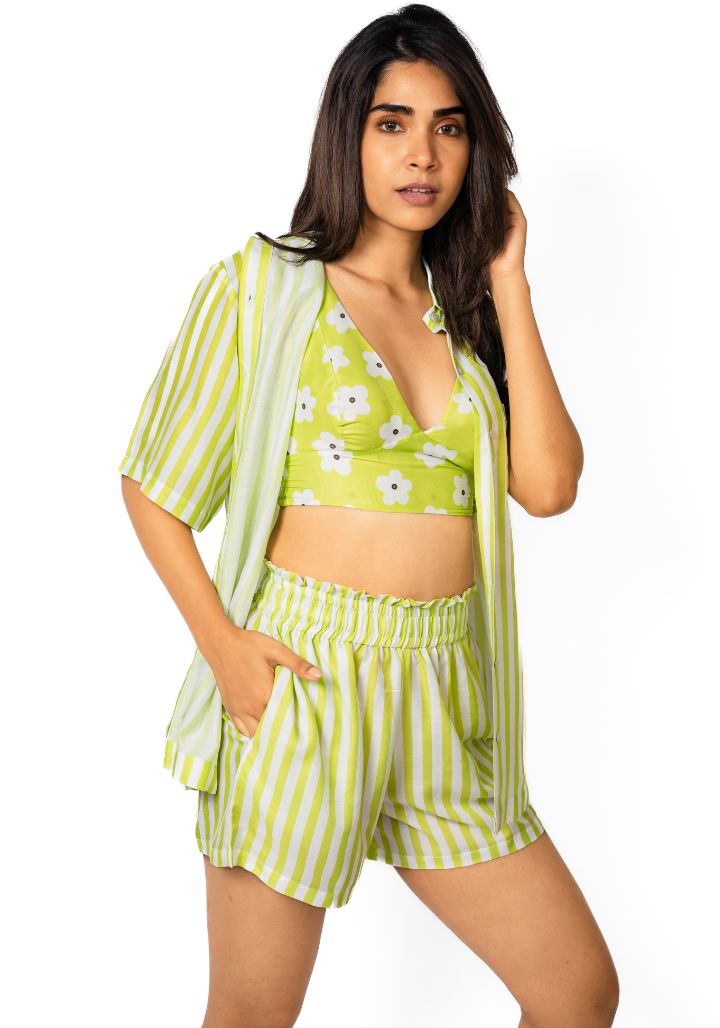 - 3-piece set includes striped button-down shirt, high-waisted shorts, and floral bralette