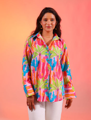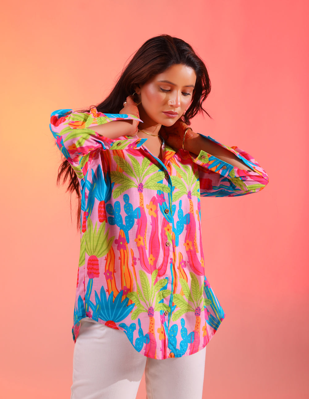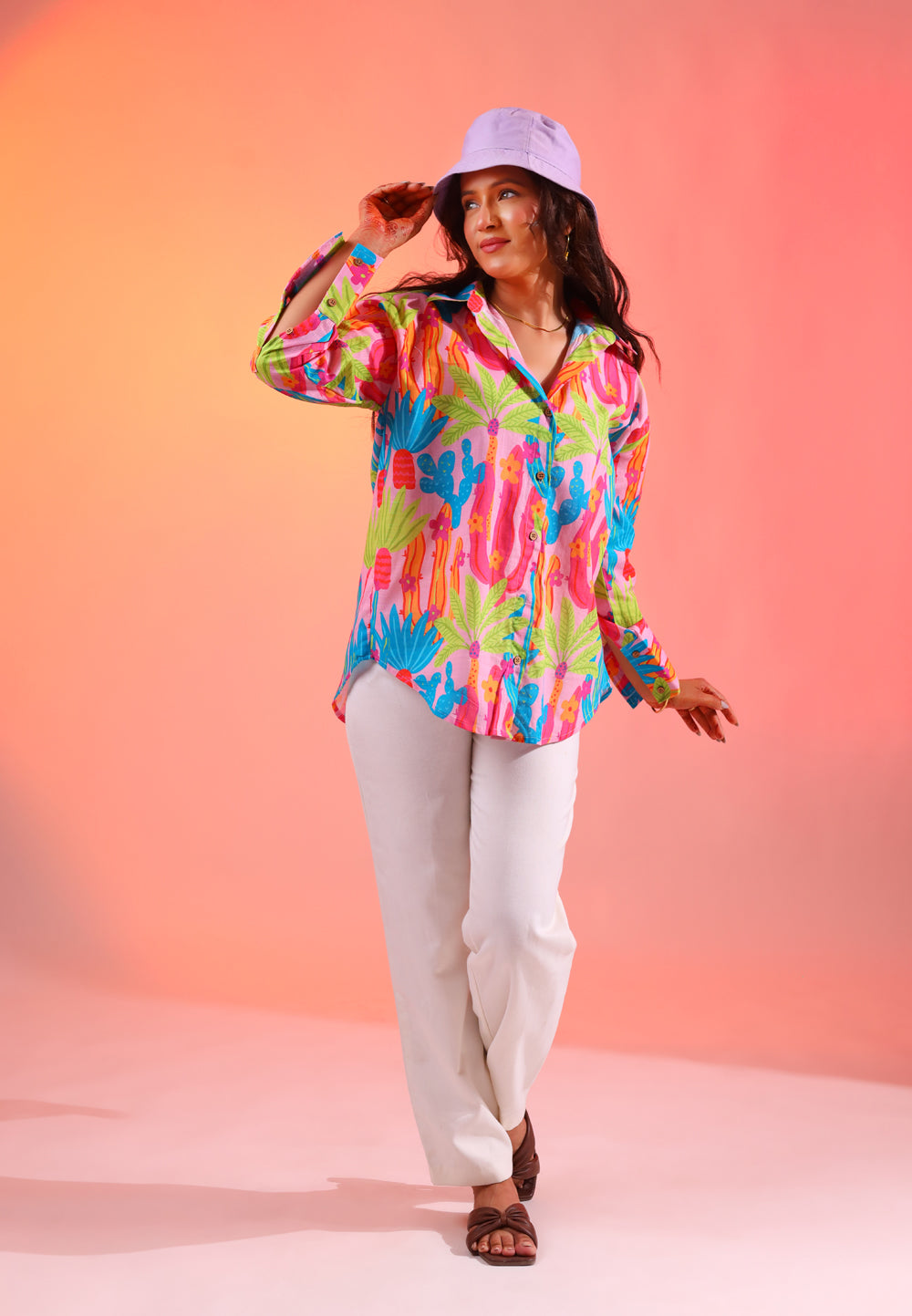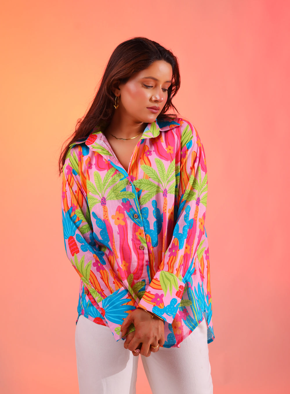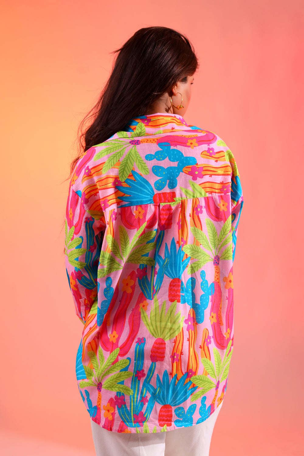 Retro meets bold in this oversized shirt featuring a trippy succulent print in vibrant, groovy hues. Crafted from soft, breathable cotton with a drop-shoulder fit, it’s your go-to piece for standout comfort from city strolls to couch days.