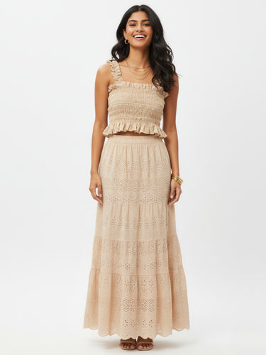 Effortlessly chic and feminine, this Hakoba embroidered beige co-ord set pairs timeless embroidery with modern details. The ruched top features ruffle straps and a fitted silhouette for a playful finish, while the flowing maxi skirt showcases delicate eyelet embroidery in tiered panels. Comfortable yet stylish, this set transitions seamlessly from casual outings to festive gatherings.