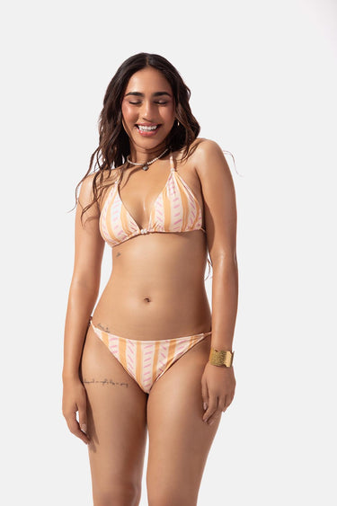 Add a splash of colour to your swim wardrobe with this vibrant triangle bikini set, featuring a unique hand-painted stripe print for an artsy twist. The triangle top is finished with removable cups and delicate pearl bead accents, while the mid-rise bottoms feature tie-up sides and mid back coverage for a flattering fit. Crafted from ultra-soft stretch fabric, it’s equal parts colourful, comfortable, and statement-making.
