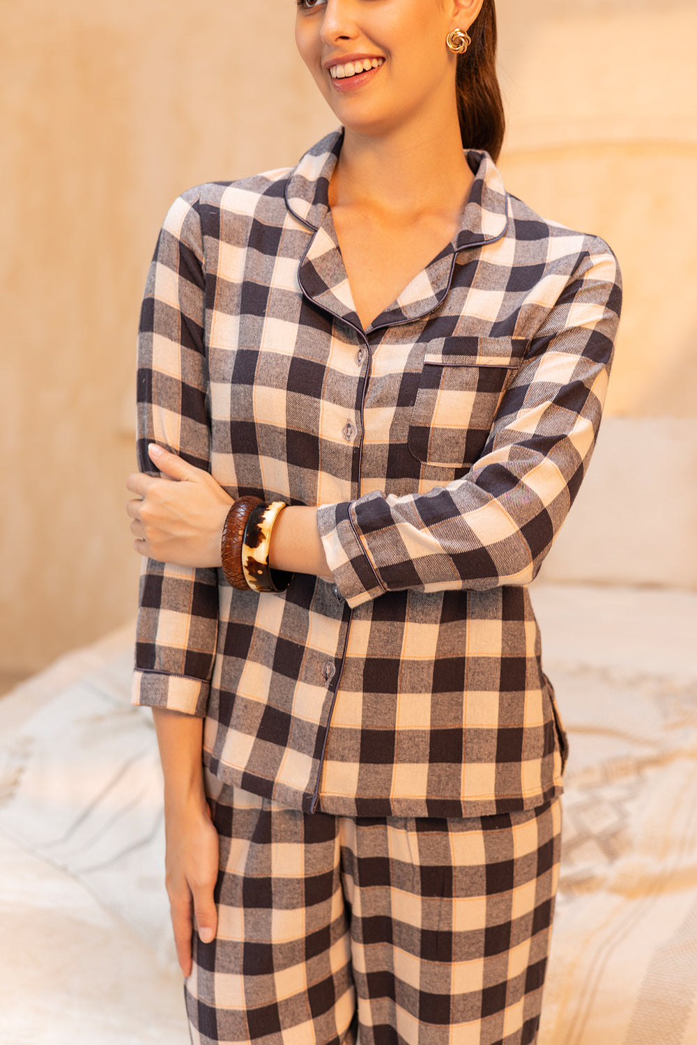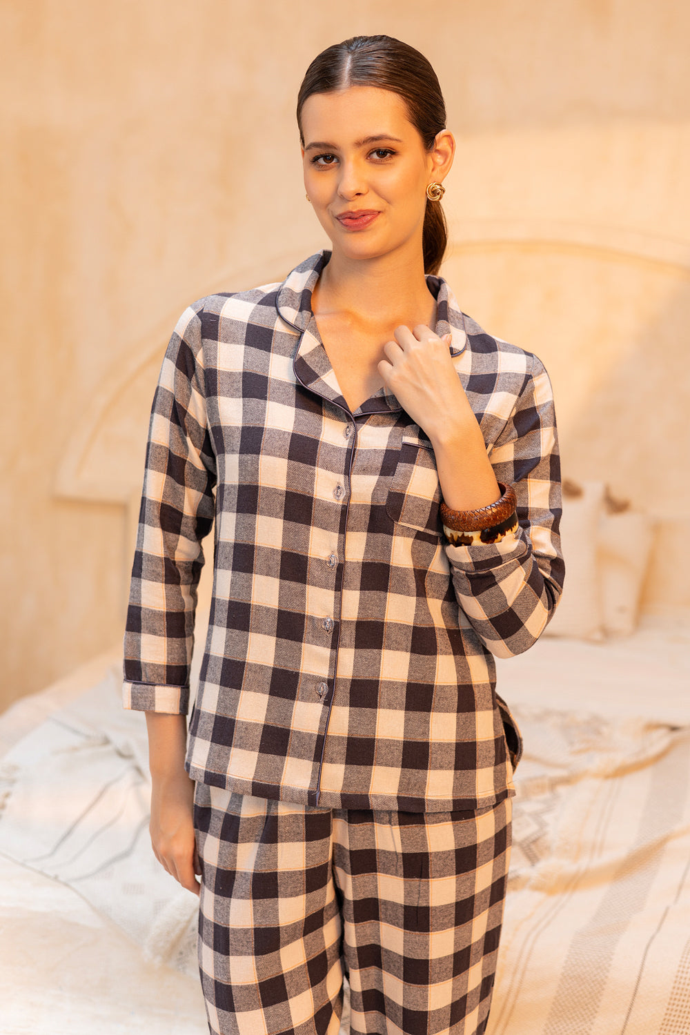 Classic Winter Check Flannel PJ Set Stay cozy in timeless style with our Classic Winter Check Flannel PJ Set. Made from warm, soft flannel, this set features a traditional classic collar shirt paired with matching checked pajamas. Designed with comfort and functionality in mind, the pajama bottoms come with handy side pockets — perfect for those chilly winter nights.