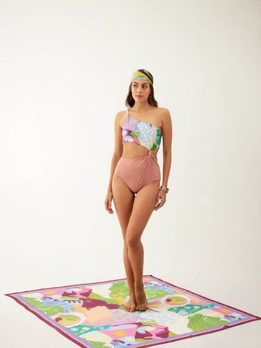 The Lash Swimsuit is the perfect mix of safe and sexy. With its one-shoulder silhouette and hand-crocheted strap, it’s detailed yet daring. A sculpting waist cut-out flatters your curves, while the color gradient flows from cobalt blue to a tropical Madagascar print, ending in bold candy red.