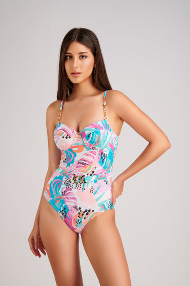 Turn heads in our Aqua Leaf Underwire Swimsuit — a sultry yet elegant one-piece that flatters, supports, and stuns with its tropical-inspired print and sculpted fit.