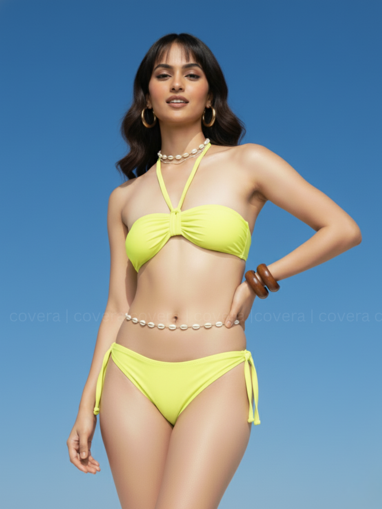 Bright, bold, and made to stand out — the Maldives Neon Halter Bikini Set is your ultimate sunshine essential. Designed in a striking neon yellow hue, this bikini brings an instant glow to your beach look. The halter-neck top with a chic front knot detailing pairs perfectly with adjustable tie-side bottoms, offering both comfort and a customizable fit. Crafted from smooth, stretchable fabric, it hugs your curves while letting you move freely through every wave and breeze.