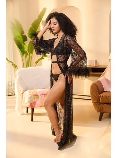 Elevate your elegance with the stunning Black Embellished Robe & Lingerie Set. Designed for unforgettable moments, this luxurious set features an embellished bra and thong paired with a flowing full-length robe. The robe is crafted from hand-beaded tulle, accented with feathered cuffs and a belted waist for a flattering, custom fit. Whether for a wedding, honeymoon, or special occasion, this ensemble exudes refined glamour and timeless sophistication.