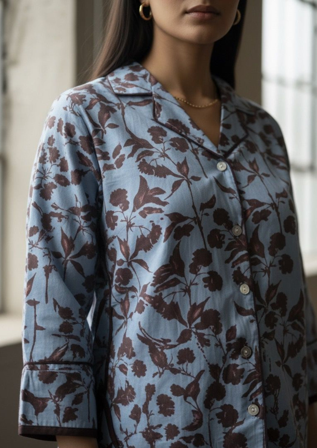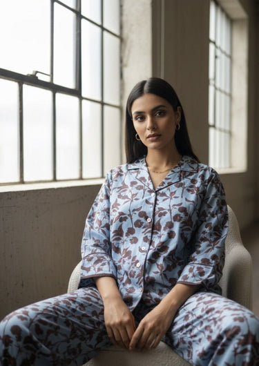 Meet your new everyday indulgence — the Mist Bloom Night Suit, where comfort meets quiet sophistication. Crafted in fine cotton with a subtle floral print, it blends the beauty of nature with a hint of tailored elegance.
