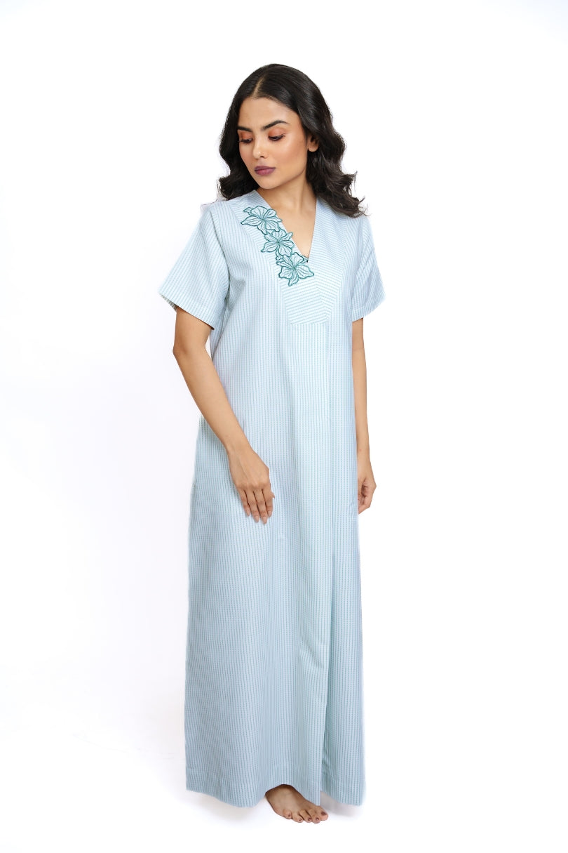 Cool, calming, and crafted for comfort — the Mistleaf Cotton Nighty is a refreshing blend of simplicity and sophistication. Designed in breathable cotton with subtle embroidery, it’s perfect for restful nights and relaxed mornings.