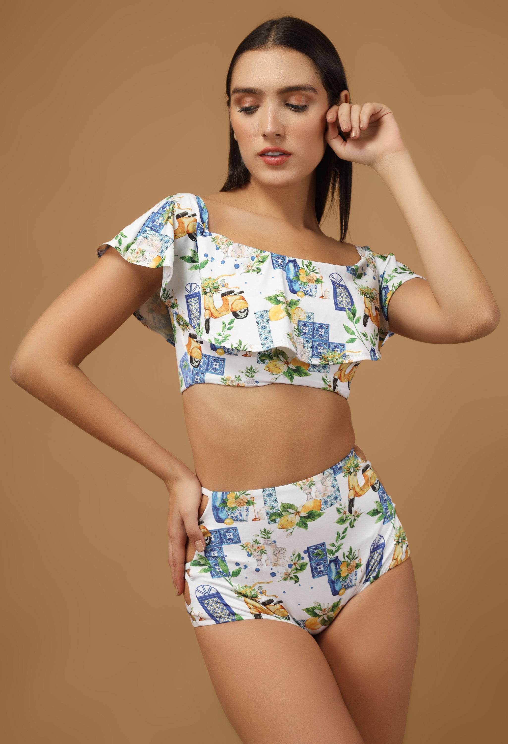 A Moroccan-inspired white two-piece swimsuit with playful ruffles and chic cutwork detailing the perfect mix of fun and flattering for your next vacation.