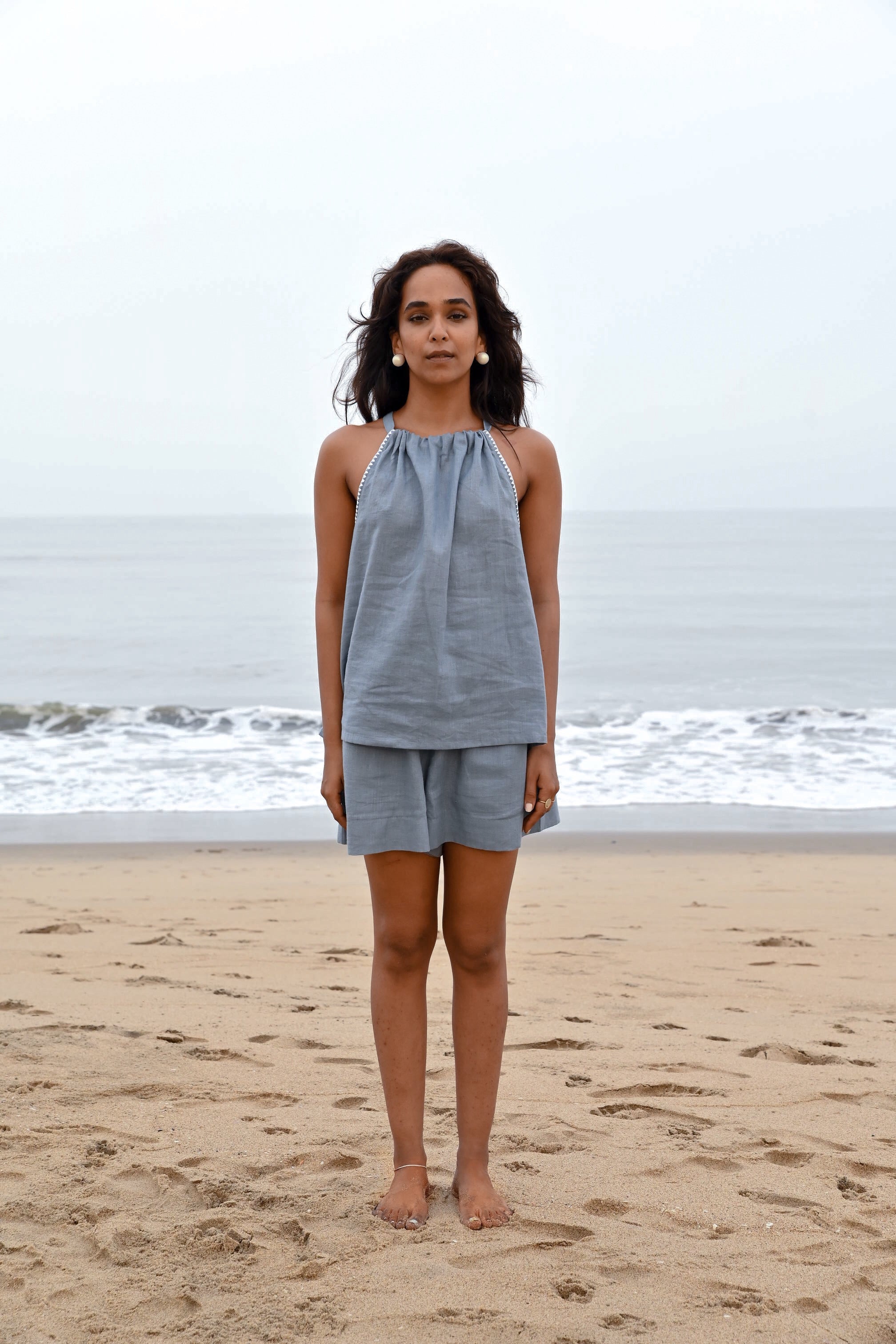 Effortless and breathable, this European linen co-ord set is designed for elevated everyday comfort. The relaxed tie-up top with embroidered armhole detail pairs perfectly with high-waisted wide-leg trousers, complete with an elasticated waist and side pockets for ease. Ideal for warm-weather styling, this set moves seamlessly from casual days to chic resort evenings.