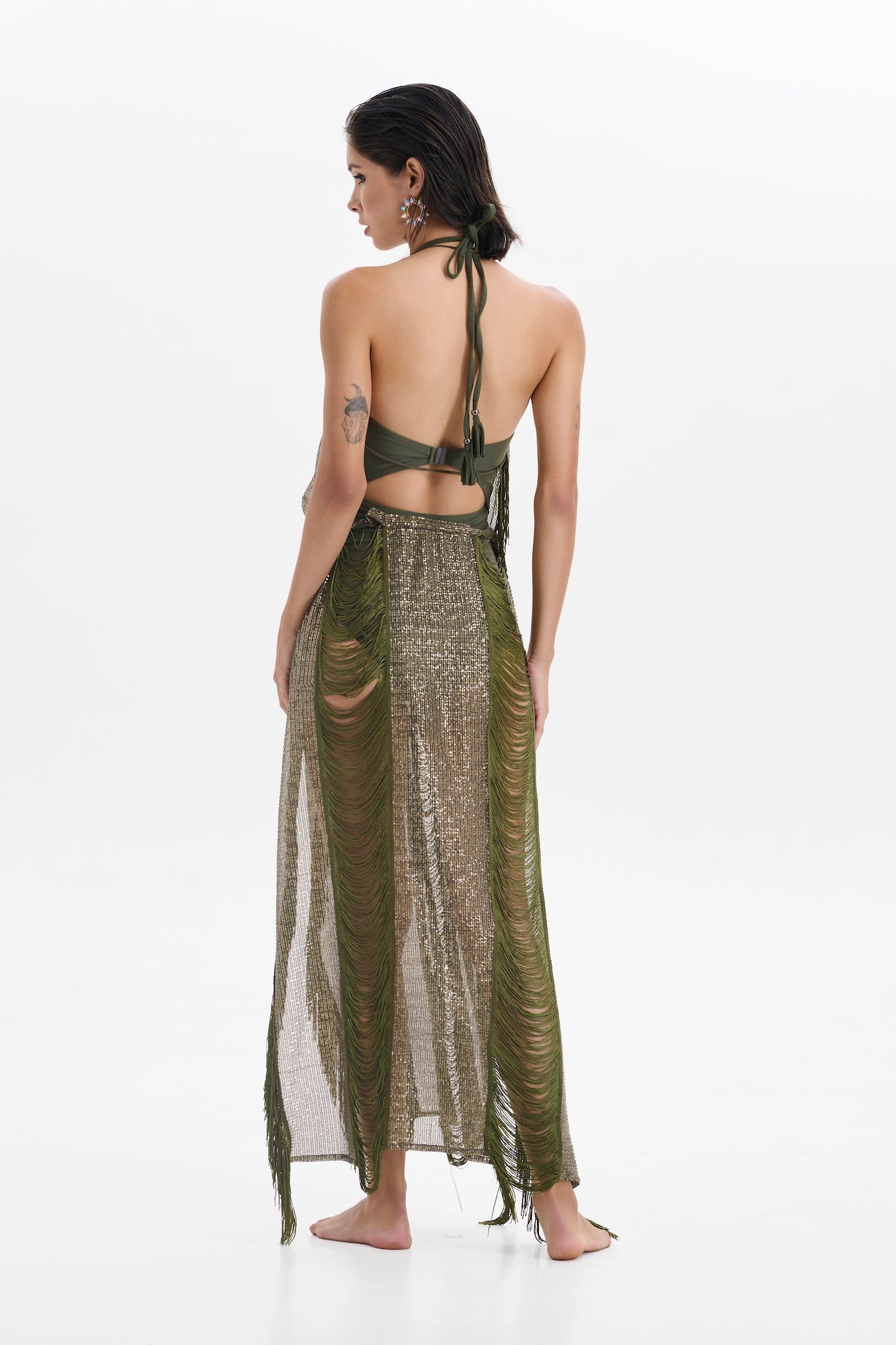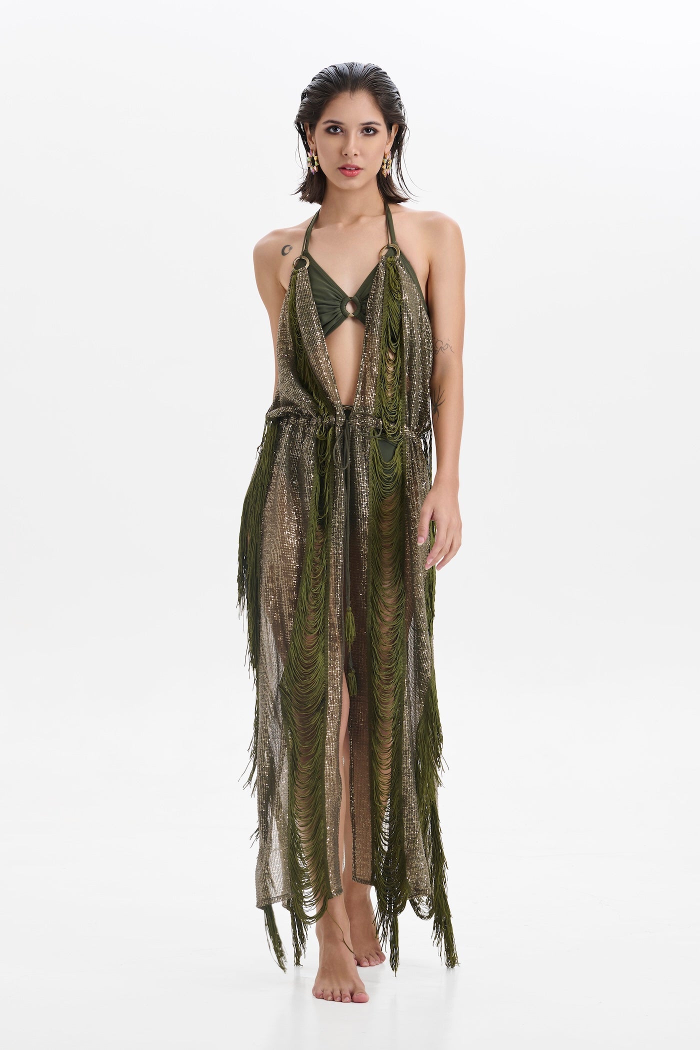 The Olive Halter Swim Cape redefines beachside elegance with its fluid silhouette and sophisticated charm. Designed with a halter neckline that ties gracefully at the neck, it drapes effortlessly over your swimwear, creating a look that’s both dramatic and refined. The rich olive hue enhances its timeless appeal, while the lightweight fabric adds graceful movement with every step.