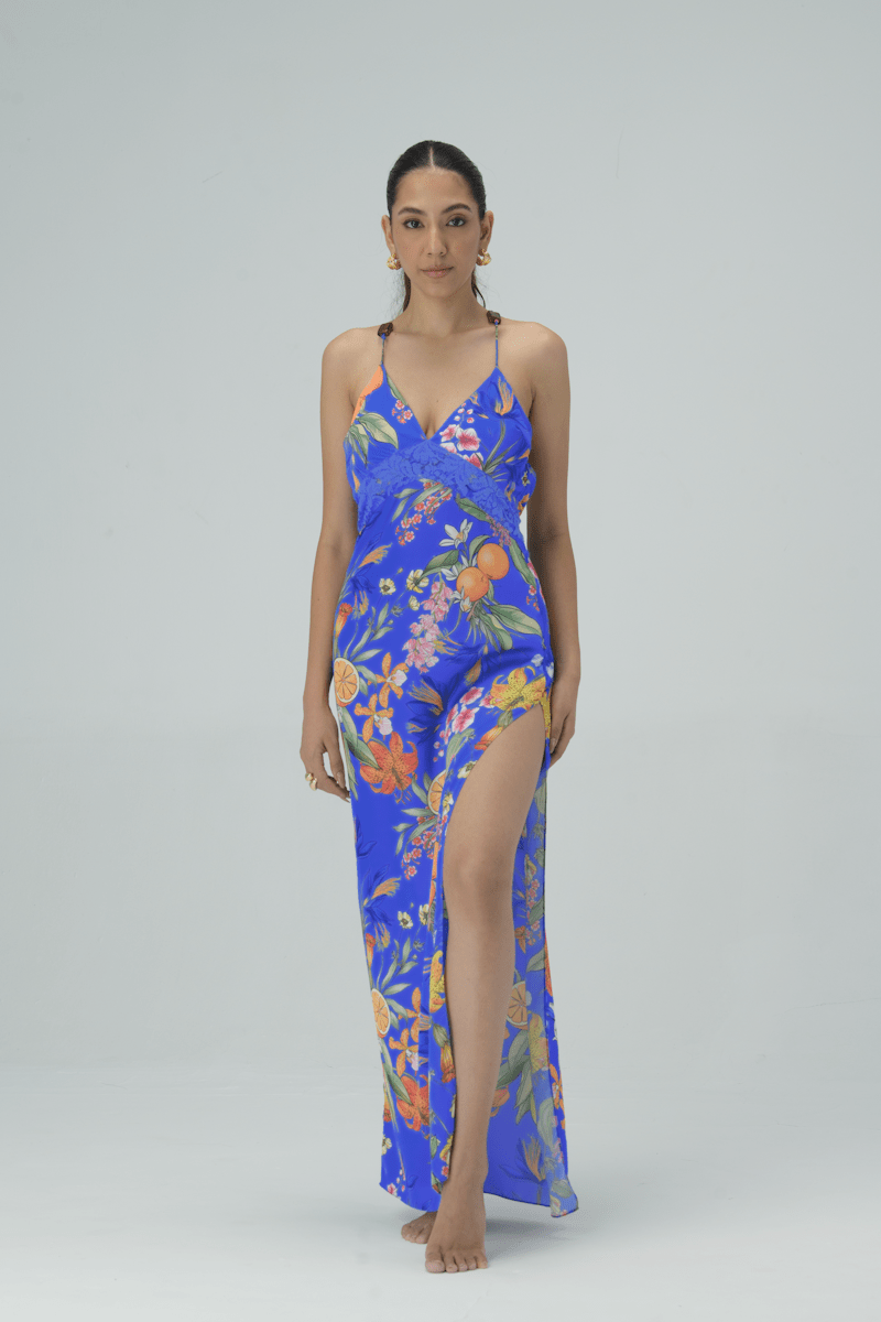 A chic silhouette crafted with thoughtful detailing, this design is made to flatter while keeping comfort in mind. With stone-embellished straps and a fluid side slit, it transitions effortlessly from day resort wear to evening elegance.
