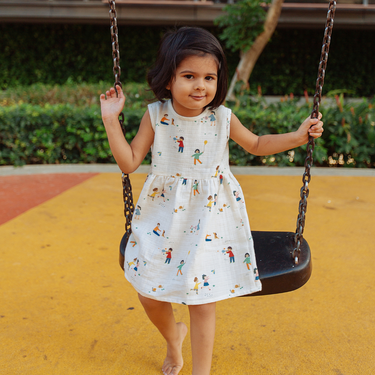 Fun, frilly, and full of charm — this breezy muslin dress is made for sunny days and twirly playdates. With its airy A-line cut and soft organic fabric, it keeps your little one cool and comfy, while delicate mother-of-pearl buttons add just the right touch of polish.