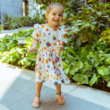 Fun, frilly, and made for twirls — this lightweight muslin dress is perfect for parties, playdates, and everything in between. With a breezy A-line silhouette and delicate mother-of-pearl buttons, it’s both adorable and incredibly comfortable for warm Indian days.