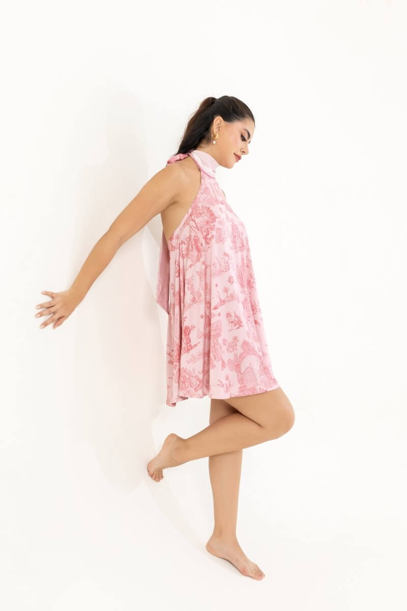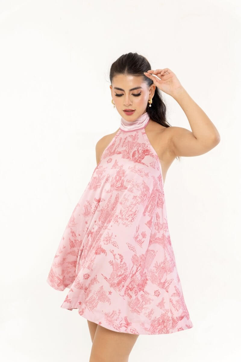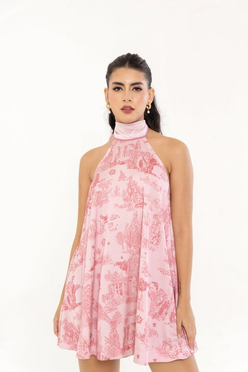 A statement halter dress crafted in premium silk satin, designed with a flowing circular cut that moves beautifully. The tie-up neckline and low back cut-out with elastic detail combine elegance with ease.