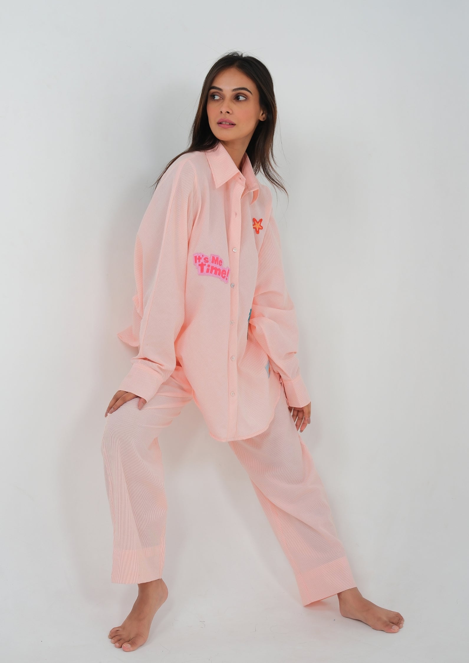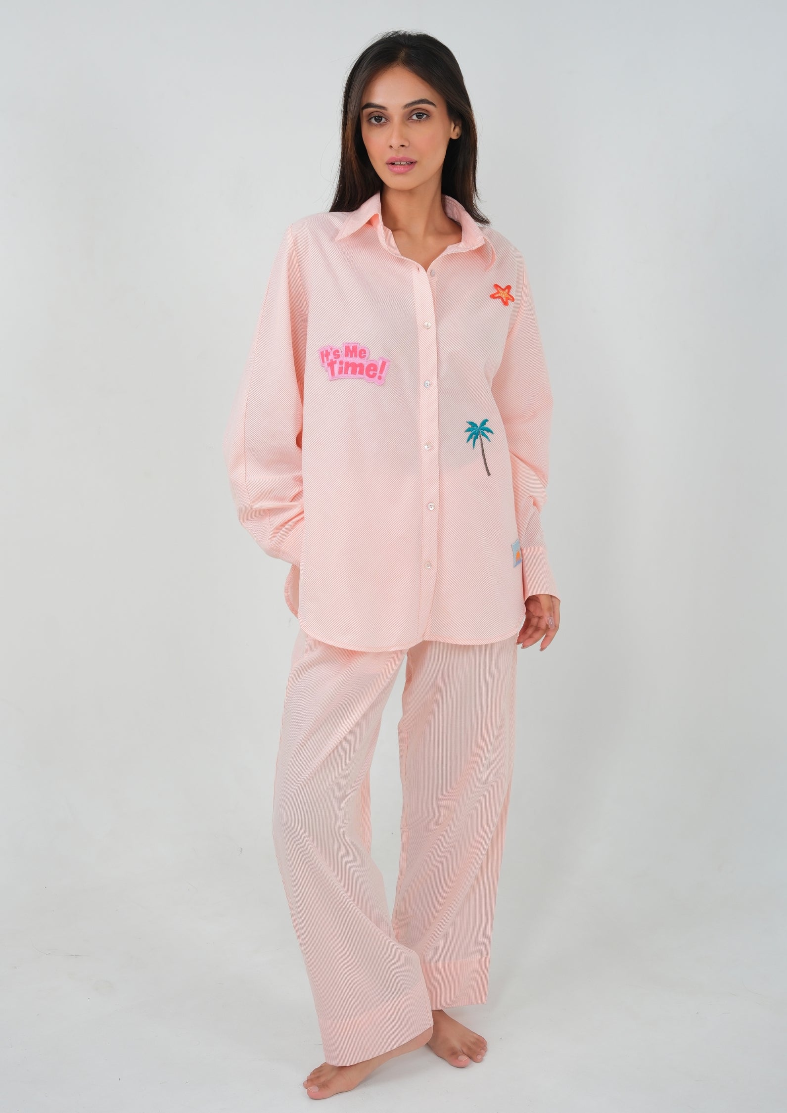 Add a fun, fresh vibe to your nightwear with this peach embroidered patch night suit. Designed with subtle vertical stripes on a soft peach base, it pairs playful embroidered patches with everyday comfort. The collared button-down shirt and straight-leg pants create a relaxed silhouette, making it perfect for lounging or gifting.