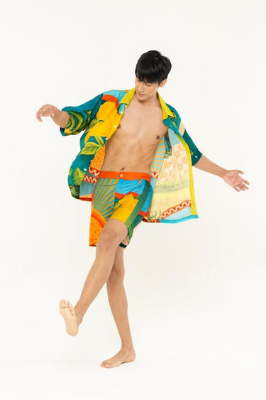 Built for movement, made for style—these long swim shorts feature the striking Abandoned Odyssey print in lightweight parachute sheeter fabric. Designed for comfort with an inner lining, they come finished with a side ombré panel and a functional lobster clasp key holder at the waist.