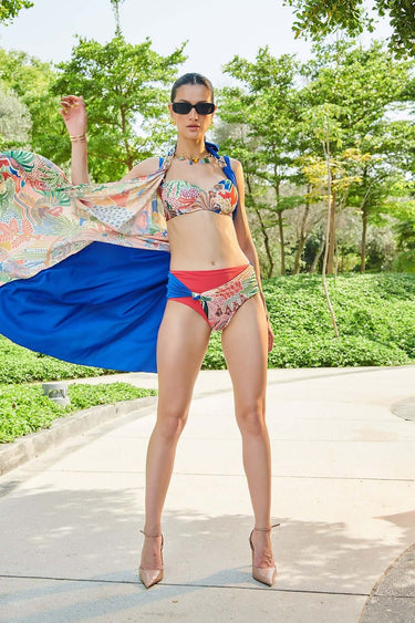 A versatile statement layer, the Furbelow Sarong is a bi-colour concept piece designed to be styled your way. Tie it at the waist as a wrap skirt or drape it around the neck as a halter — finished with gold trim along both edges for a hint of shine.