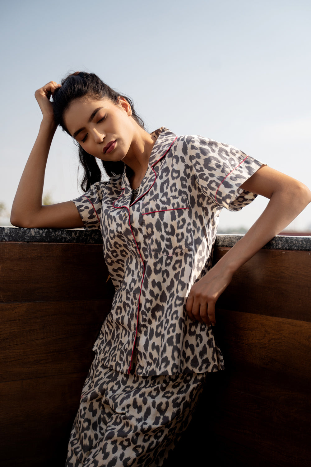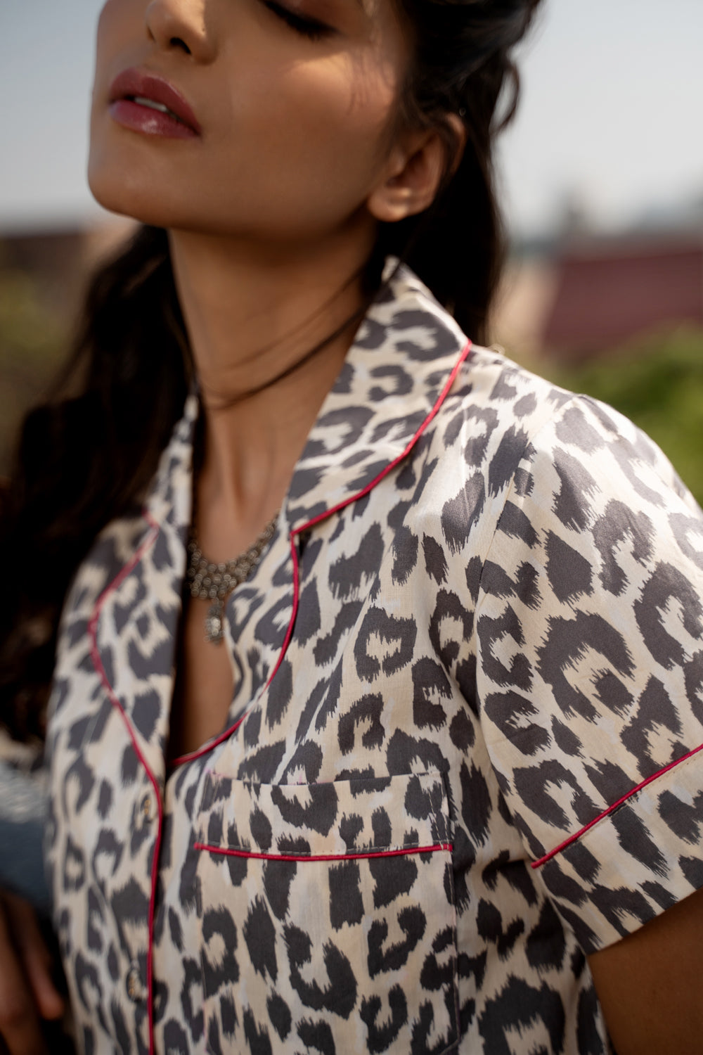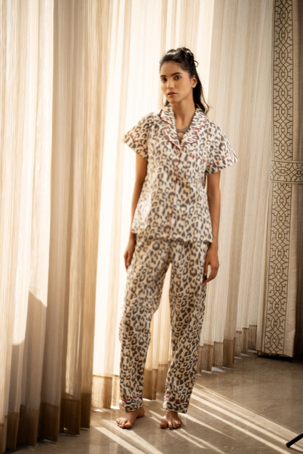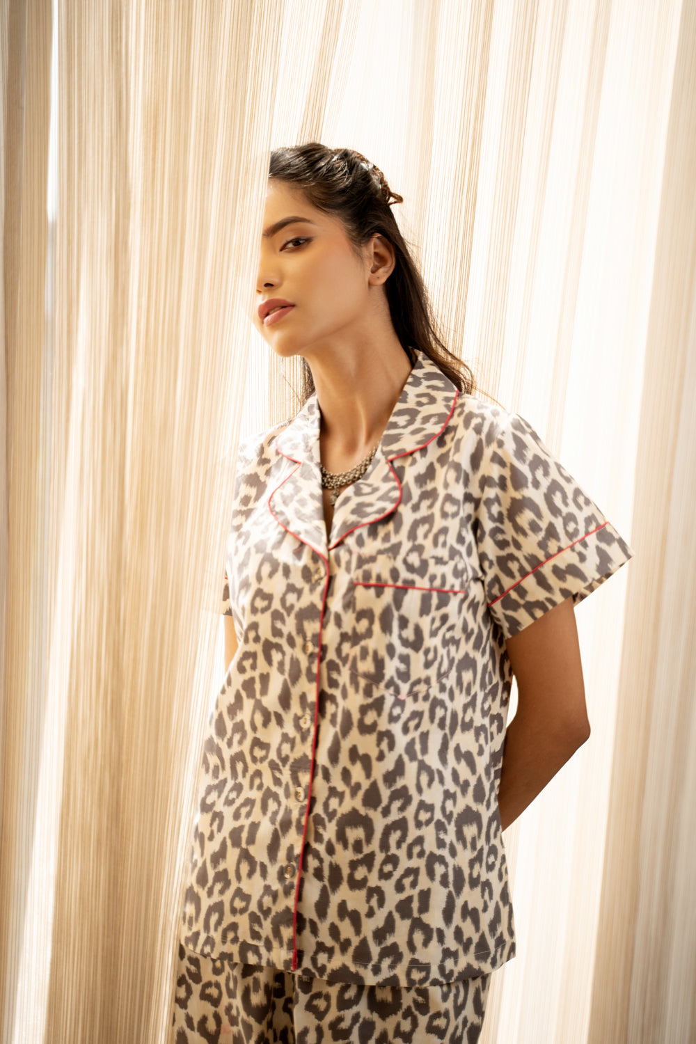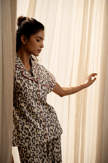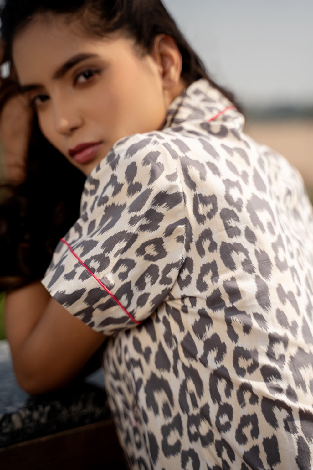 Unwind in style with this Classic Collar Night Suit in bold Leopard Print Cotton. Crafted for comfort and designed to make a statement, this set blends effortless wearability with a touch of wild elegance.