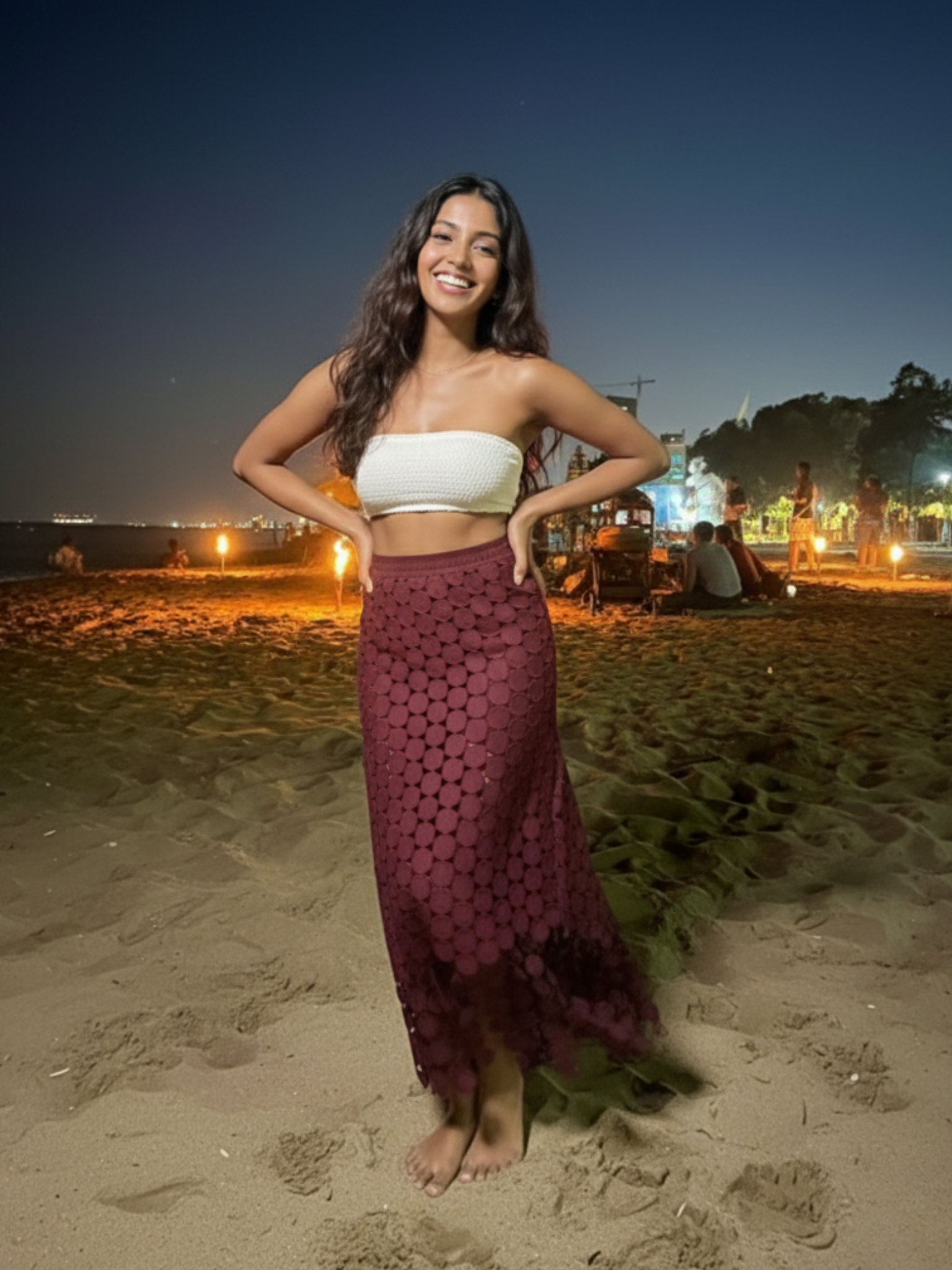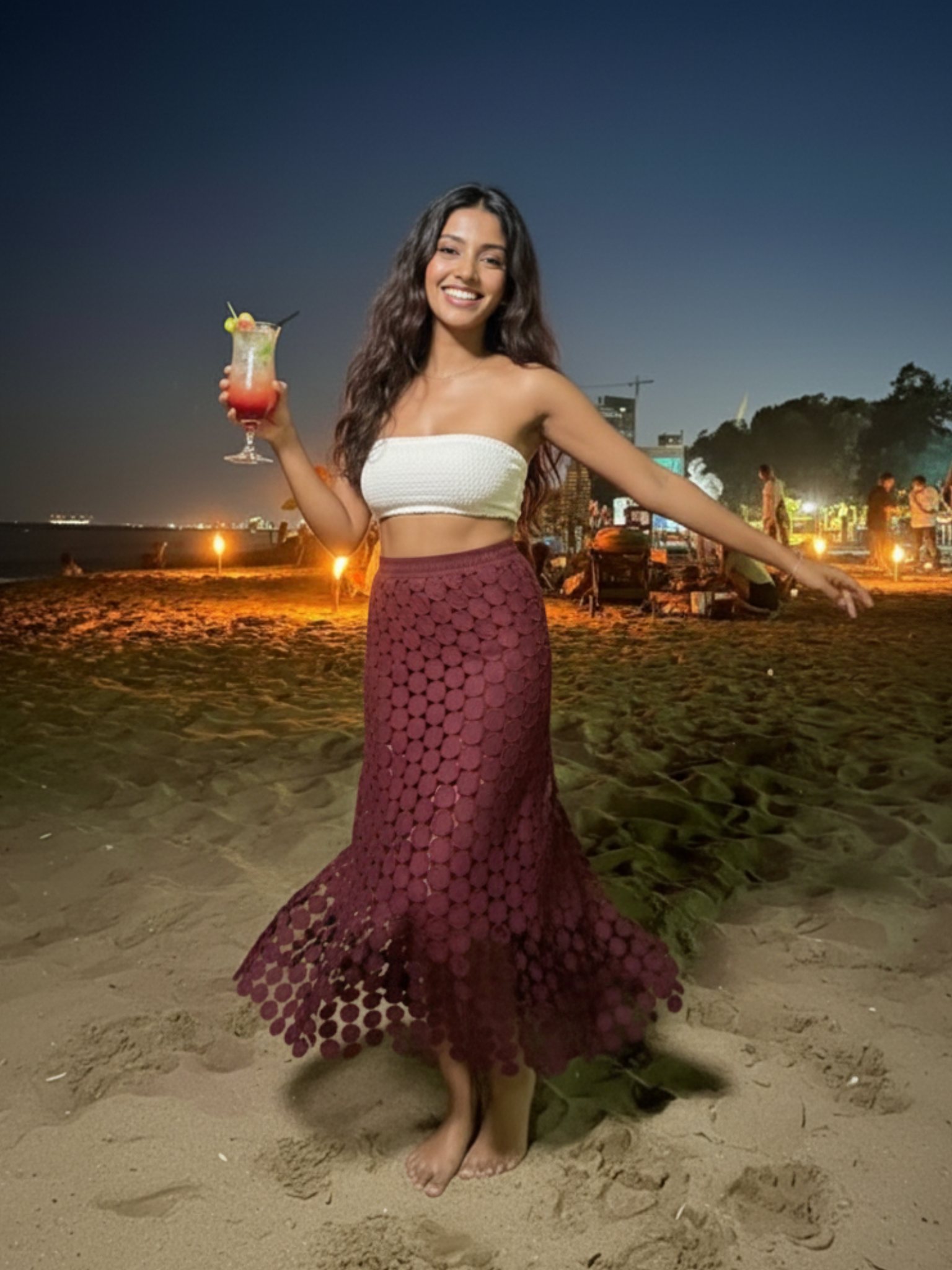 Effortless sophistication meets playful texture in our Resort Luxe Wine Skirt. Crafted in a deep wine hue, this statement piece features an intricate circular cut-out design that flows beautifully with every step. The semi-sheer finish adds a hint of allure, while the high-waist elastic band ensures a comfortable, flattering fit. Perfect for layering over swimwear or pairing with a simple crop top, this skirt transitions seamlessly from beachside brunches to sunset soirées.