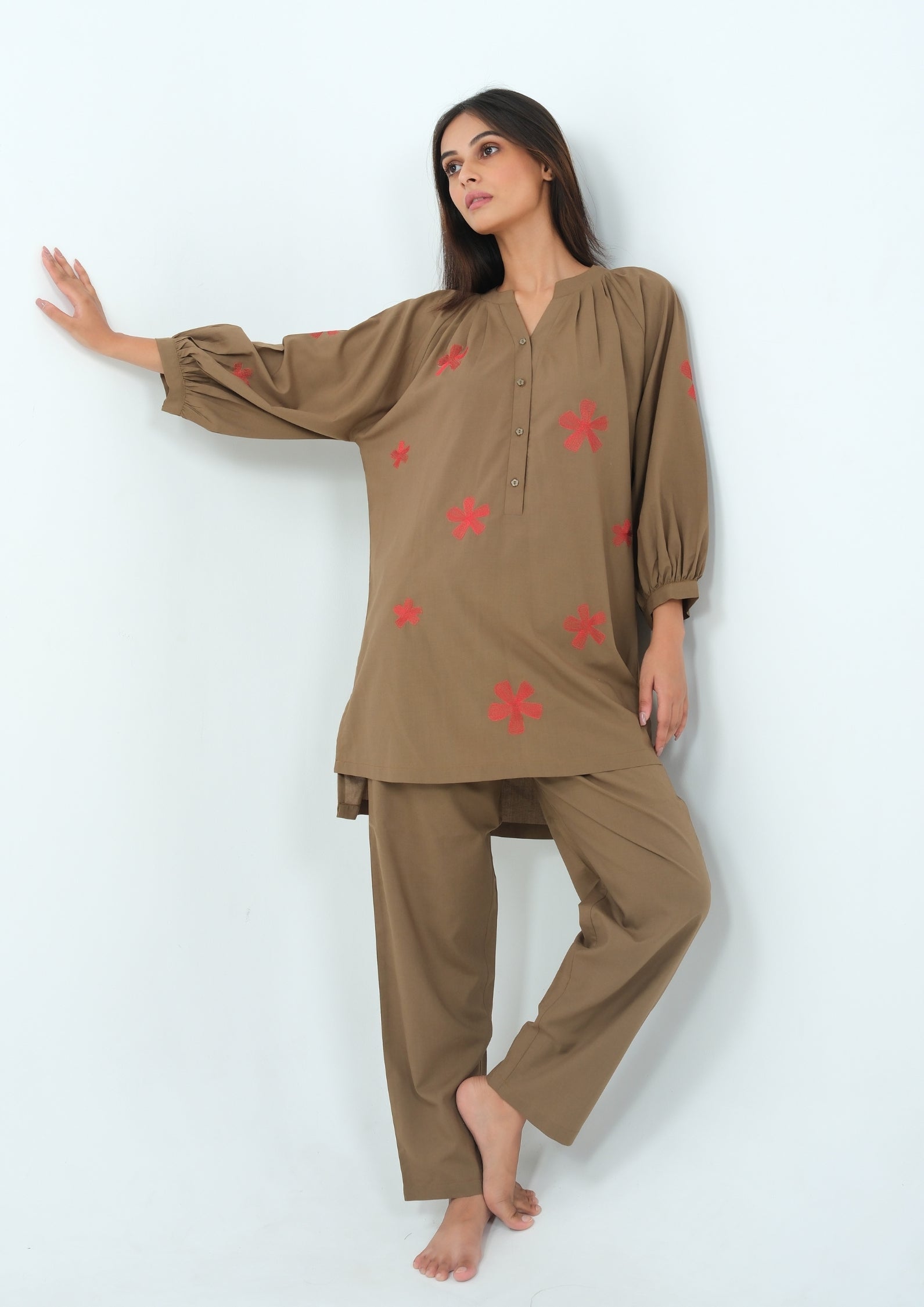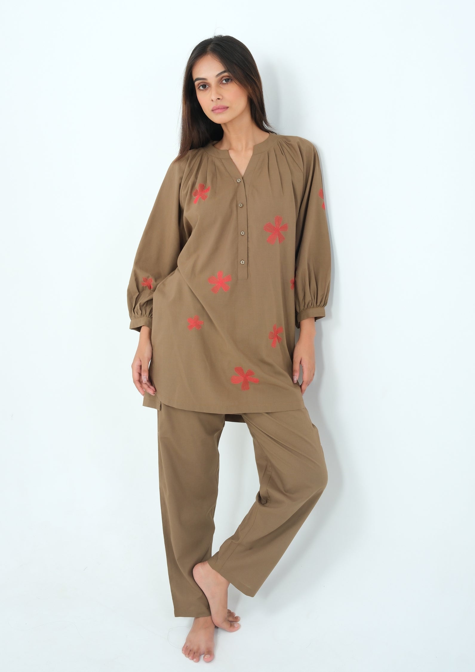 Step into effortless comfort with our Rustic Bloom Cotton Pajama Set, featuring delicate red flower motifs that bring a touch of charm to your loungewear. Crafted from breathable cotton, this set is designed to keep you cool and at ease through long nights and lazy mornings. The relaxed-fit kurta top is accented with soft gathers at the yoke and paired with straight-cut pajama bottoms for an easy, flattering silhouette.
