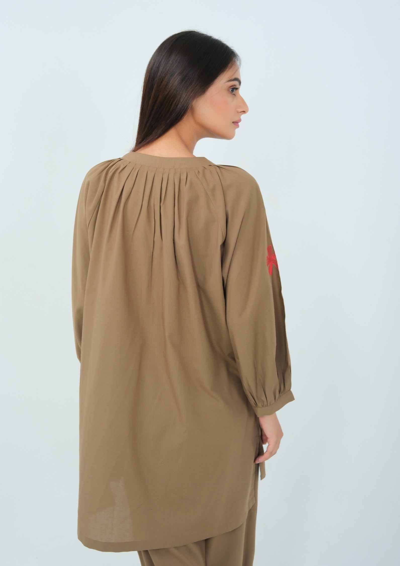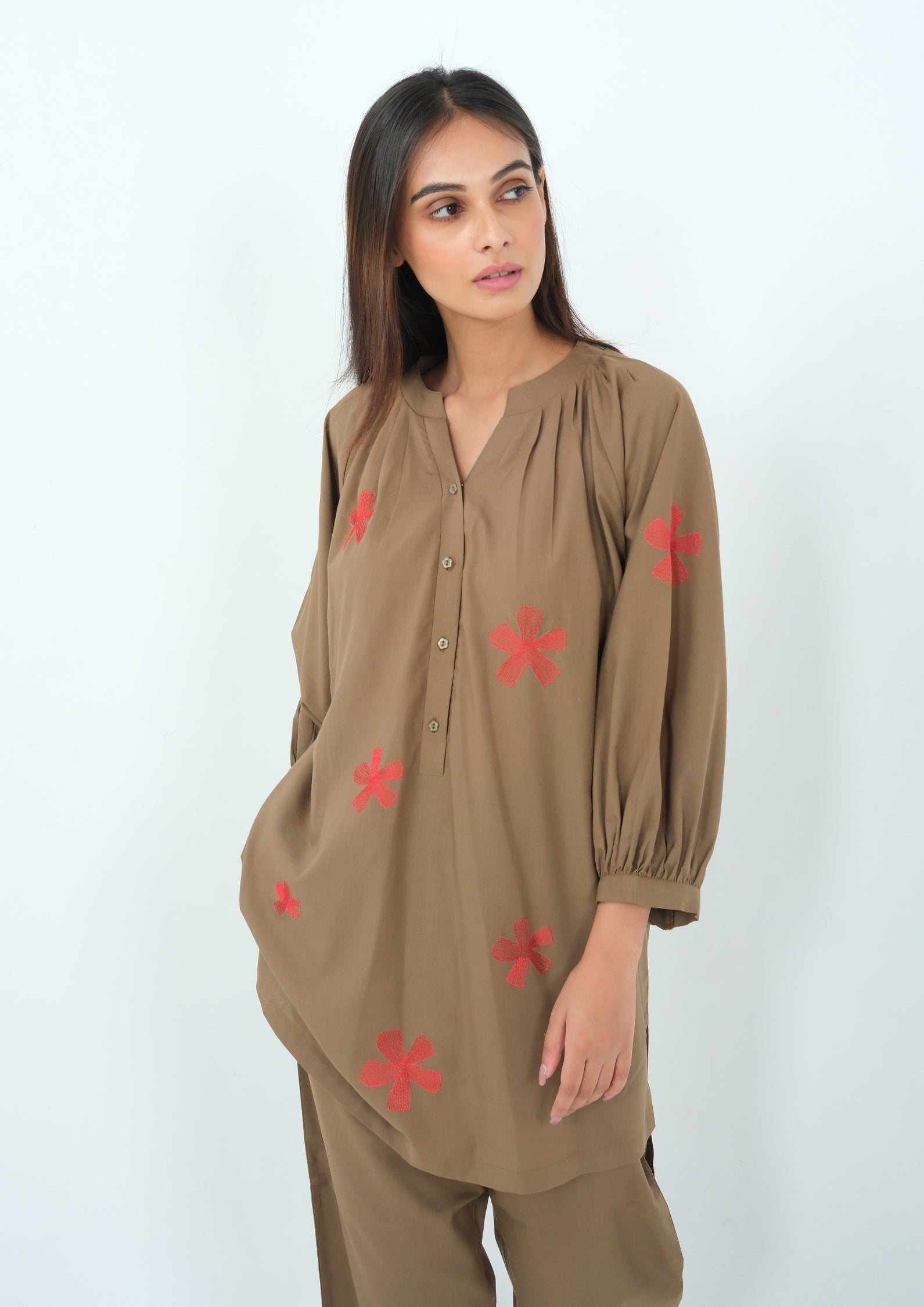 • Sleeves: Three-quarter balloon sleeves with gathered, elasticated cuffs for a stylish and airy feel.