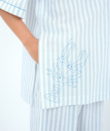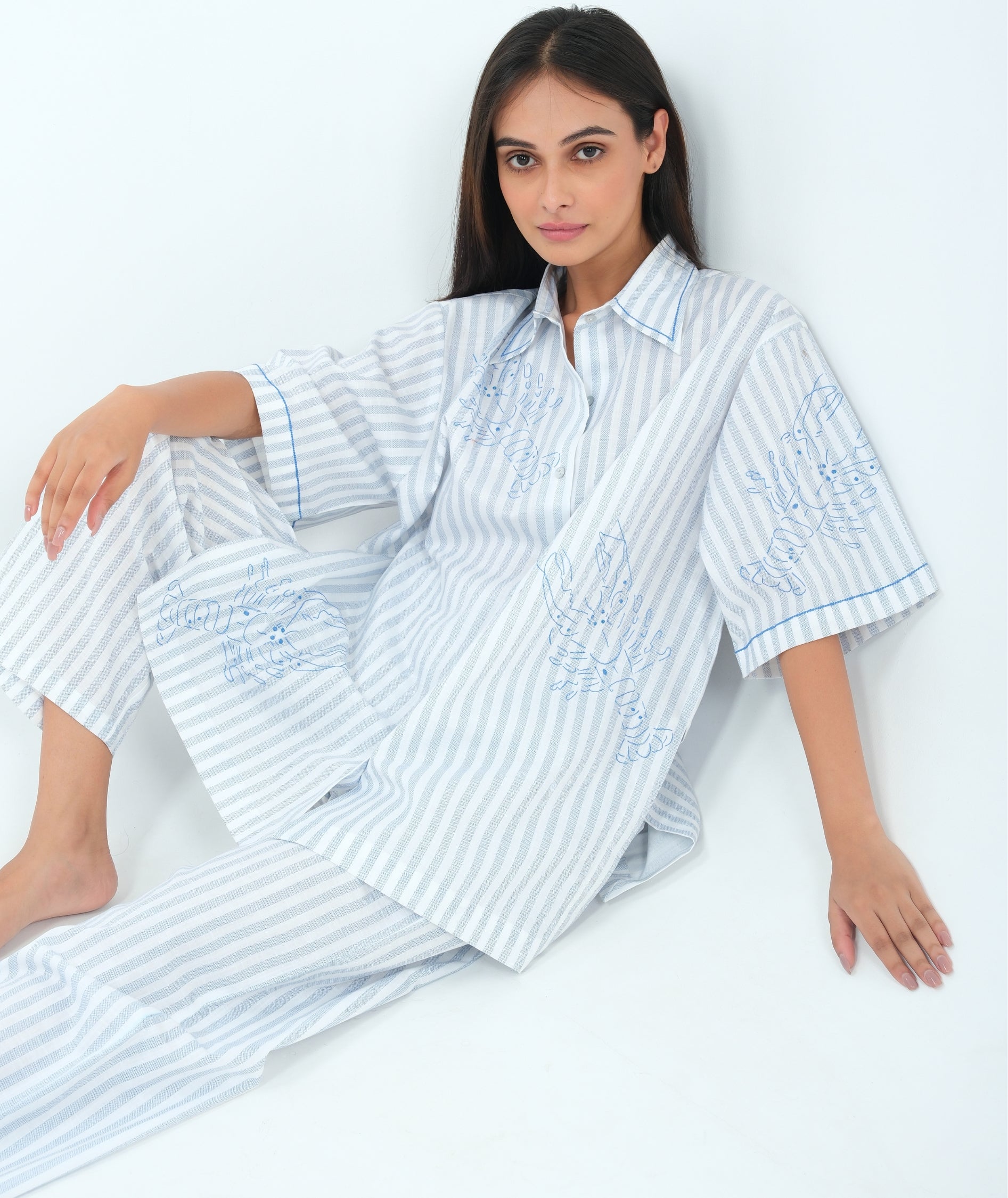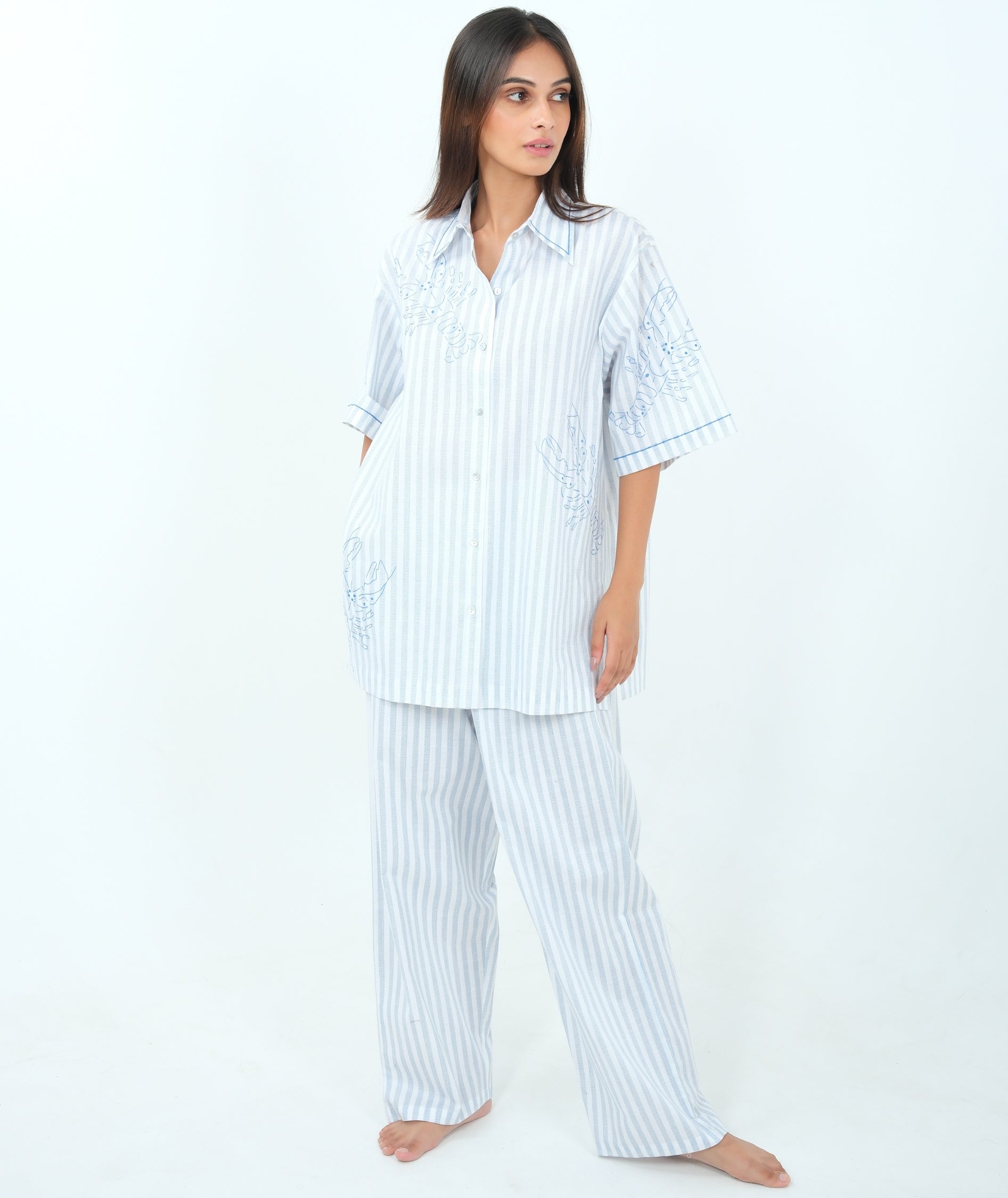 Dive into comfort with the Seaside Charm Night Suit — a breezy striped set that blends playful embroidery with everyday ease. Designed for style and relaxation, it brings a touch of coastal charm to your nightwear.