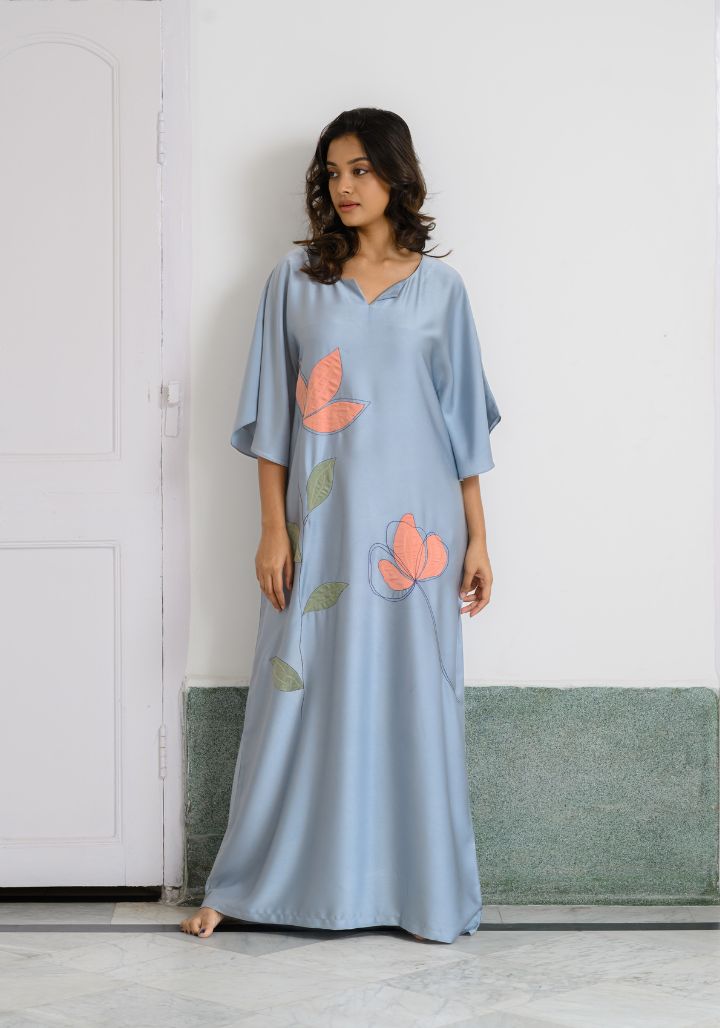 Bring effortless elegance to your wardrobe with this Grey Satin Kaftan — a luxurious piece that blends comfort with standout style for both lounging and elevated occasions.