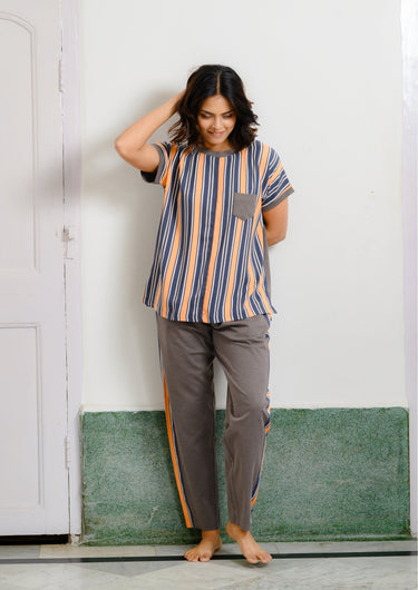 Bring a pop of playful style to your downtime with our Sunset Stripes Comfort Night Suit. Featuring a relaxed-fit top with bold vertical stripes in sunset orange, deep navy, and soft grey, paired with matching solid grey bottoms accented by side stripe panels for a coordinated look. The short-sleeved top with a chest pocket offers laid-back charm, while the breathable stretch fabric ensures all-night comfort and freedom of movement. Perfect for lounging at home or enjoying a cozy night in.