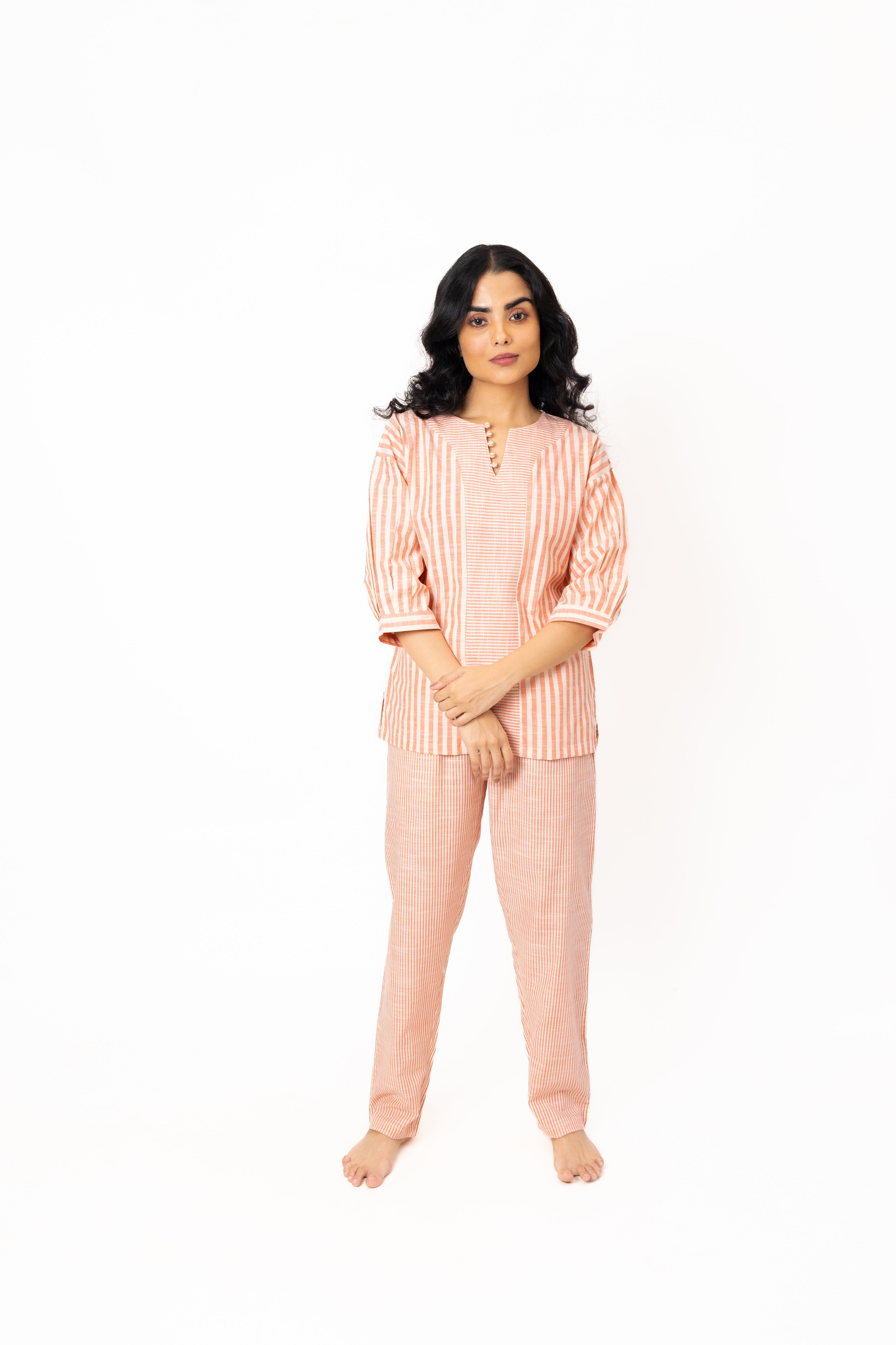 Elevate your loungewear game with this striped cotton night suit — a two-piece set designed for effortless comfort and everyday elegance. Made from 100% breathable cotton, it offers softness, ease, and timeless style.