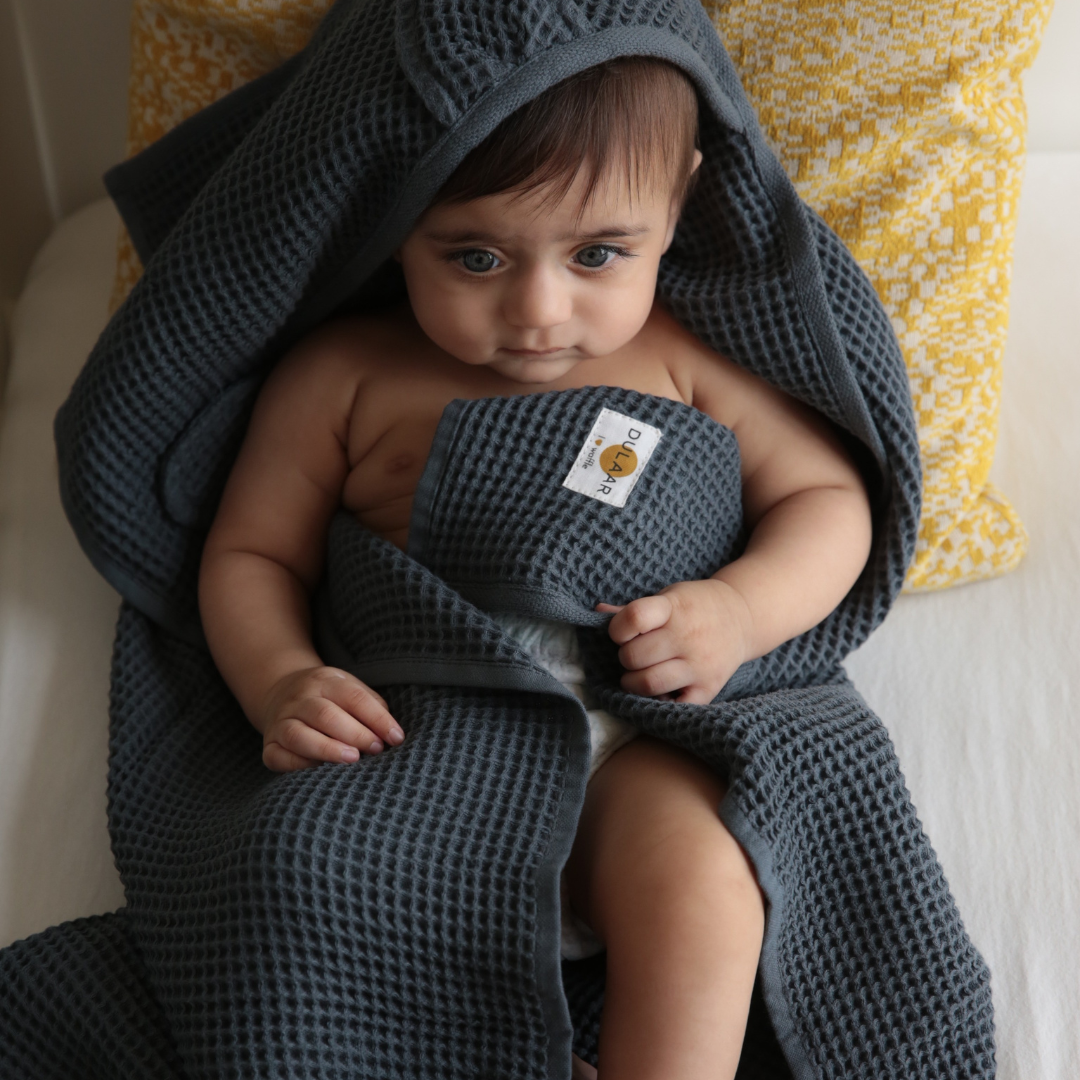 Wrap them in softness after every splash. This cozy waffle-weave hooded towel is ultra-absorbent, fast-drying, and designed to get softer with every wash. Sized to last through toddlerhood and gentle on delicate skin, it’s the perfect bath-time essential — with the option to personalise it with their name or initials.