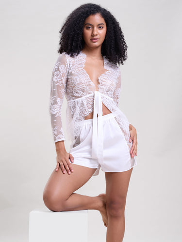 Add a touch of elegance to your wardrobe with the White Chantilly Lace Shrug & Shorts Set. Crafted from lightweight, delicate lace, the shrug ties at the front to create a soft, feminine look. Paired with high-waisted lace shorts designed for a comfortable and flattering fit, this set offers effortless style for lounging or special occasions. Ethically made in our atelier and finished with Mysthelle's signature gold hardware, it's a timeless and versatile addition to your collection.