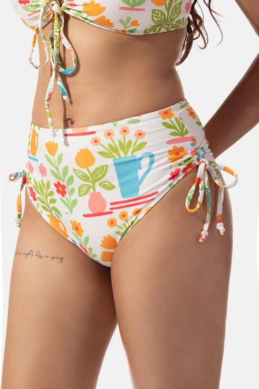 Feminine, flattering, and fuss-free this high-waist bikini bottom features a vibrant multicolor floral print on a fresh white base. With adjustable side strings and soft ruching at the waist, you can customize the fit to feel just right. Designed for fuller back coverage, it's made to move with you and stay comfortable all day long.