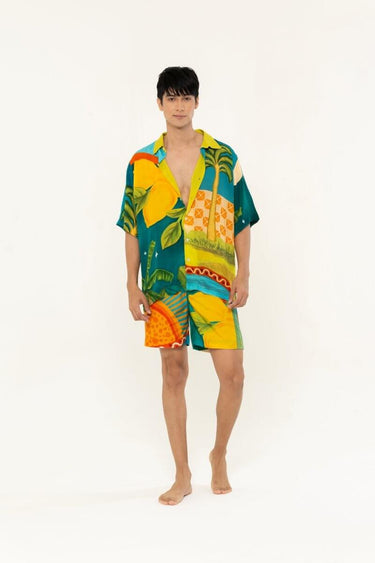 Our bestselling men’s shirt, built for ease and impact. The day-to-night resort silhouette features the Abandoned Odyssey placement print — a sprawling landscape graphic brought to life on fluid viscose silk. A contrasting solid collar adds just the right amount of structure.