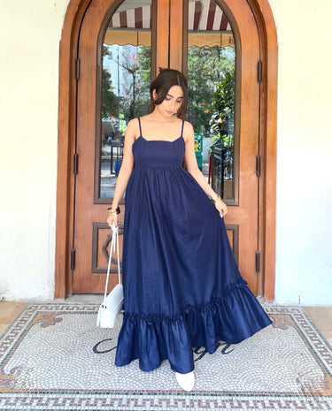 Effortlessly chic and irresistibly breezy, the Ocean Sundress captures the essence of sunlit elegance. Designed in a deep navy blue hue, this sleeveless maxi dress features delicate braided straps, a flattering sweetheart neckline, and a flowy ruffled hem that moves beautifully with every step — perfect for balmy summer days and seaside escapes.