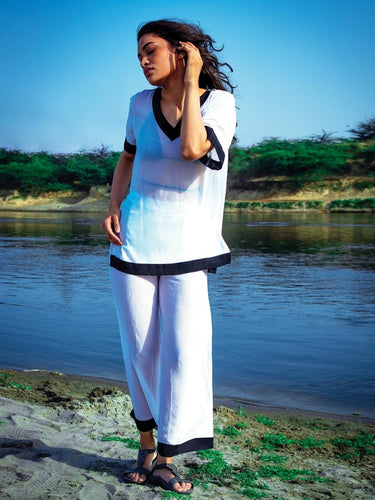 - Classic white and black co-ord set featuring a chic top and matching bottoms