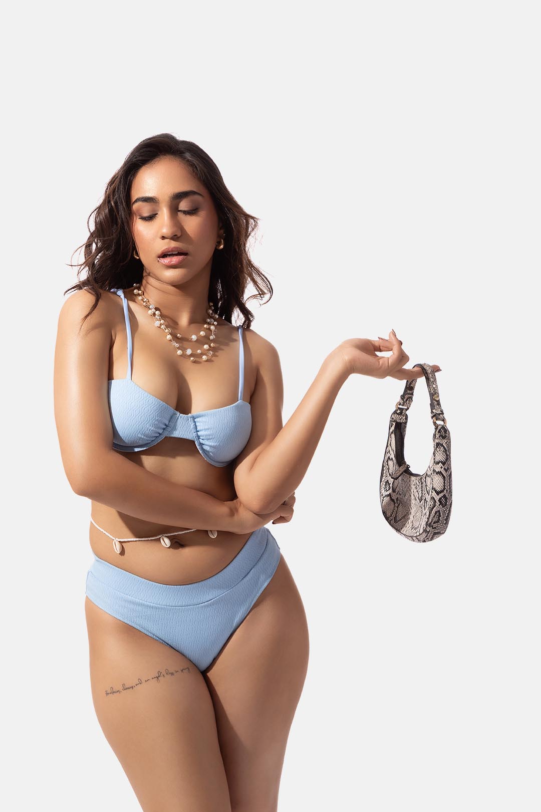 Strong on support, soft on feel — this ocean-inspired blue textured bikini top is built to flatter fuller busts. Designed with underwire construction and padded removable cups, it offers smooth shaping and lift. Adjustable shoulder straps and a tie-up back band give you control over the fit, while the ultra-soft stretch fabric keeps it comfortable from morning dips to sunset lounging.