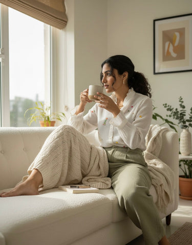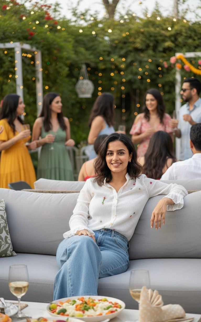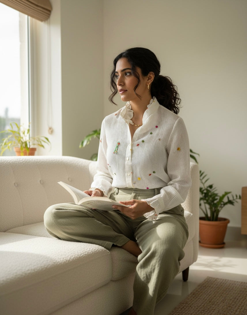 Ann’s Striped White Shirt is a breezy classic reimagined with artisanal charm. Crafted from soft chanderi cotton in an off-white tone, it is embroidered with delicate stars all over for a subtle shimmer. Gathered sleeve ends add structure, while playful latkan details bring a touch of whimsy. Designed with a soft cotton slip, it balances comfort with elegance.
