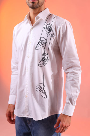 A wardrobe classic with a playful twist, this white cotton poplin shirt features hand-embroidered, quirky line artwork. Cut in a relaxed fit with full sleeves, it’s the perfect balance of minimal and memorable — ideal for casual evenings or laid-back occasions.