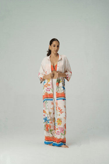 A chic placement co-ord in our all-new Ivory Frond print, blending swimwear and resortwear seamlessly. The bikini is crafted from Italian regenerated fabrics for a sculpted yet comfortable fit, while the lightweight satin co-ord adds breezy elegance.
