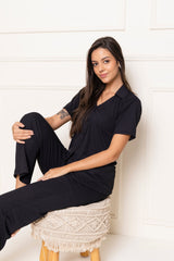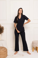 Made for slow mornings and cozy nights, this ribbed PJ set combines soft structure with easy comfort. The buttondown V-neck top pairs effortlessly with mid-rise pajamas for a look that feels as good as it looks.