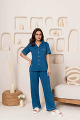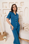 Easy, elegant, and made for everyday lounging. This short sleeve set features a classic button-down top with elbow-length sleeves and contrast piping, paired with mid-rise pants for all-day comfort. Whether you're winding down or waking up, this set makes it effortless.