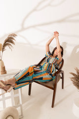 - Vibrant abstract print in bold blue, orange, and yellow hues